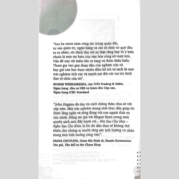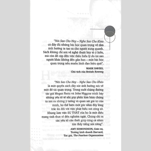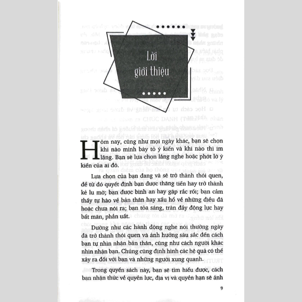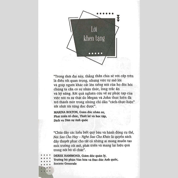 NÓI SAO CHO HAY NGHE SAO CHO KHÉO sẽ giúp bạn điều chỉnh sự khác biệt về quyền lực, để bạn có thể lên tiếng với sự tự tin và được lắng nghe. Nhưng nếu nói ra mà không ai nghe thì cũng không có nghĩa lý gì, nên sách cũng sẽ giúp bạn hiểu được quyền lực của bạn có thể khích lệ người khác lên tiếng cũng như khiến họ im lặng ra sao.