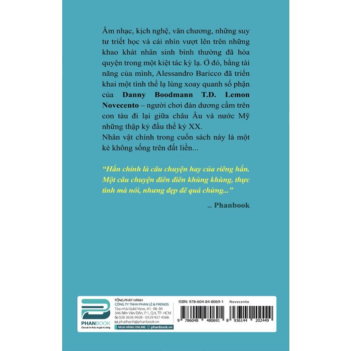 Cô đọng, giàu nhạc tính, thi tính và kịch tính, sự hài hước hòa quyện trong những suy tư triết học, Novecento - Nghệ sĩ dương cầm trên đại dương (Nguyên tác: Novecento. Un monologo) là kiệt tác mang đậm phong cách văn chương Alessandro Baricco, cũng là tác giả của Lụa.