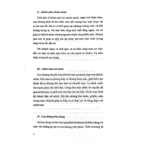 Nội dung sách được chia làm ba phần: Phần Một : Những Nguyên Tắc Chung Khảo sát thực trạng căn bản của chúng ta: bản chất và nguyên nhân những dạng thức phiền
