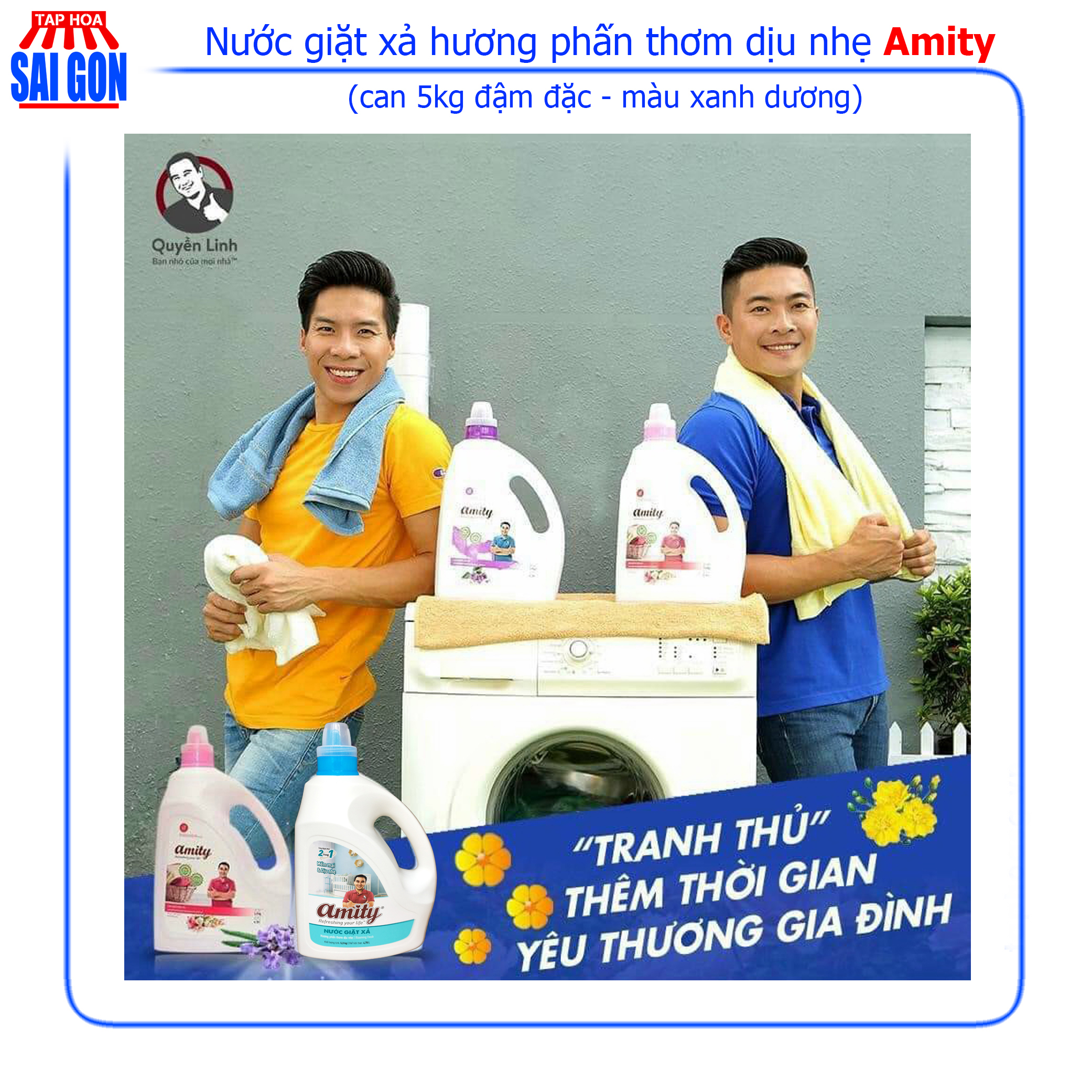 Nước Giặt Xả Amity hương phấm thơm dịu nhẹ (xanh dương) can 5kg giúp giữ mùi thơm nhẹ nhàng suốt cả ngày, một thương hiệu của MC Quyền Linh
