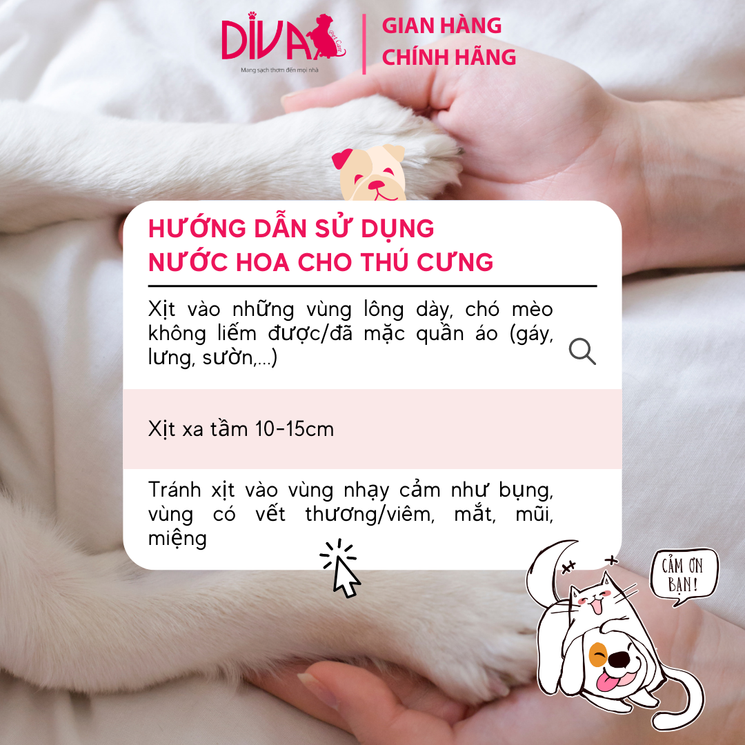 Diva tự hào là thương hiệu đầu tiên tại Việt Nam sản xuất dòng nước hoa cao cấp dành cho thú cưng. Nước hoa Diva không chứa paraben, hoàn toàn an toàn cho thú cưng và người nuôi, với khả năng lưu hương từ 2-4 ngày. Hiện tại, nước hoa Diva đã cho ra mắt 2 mùi hương đầu tiên.