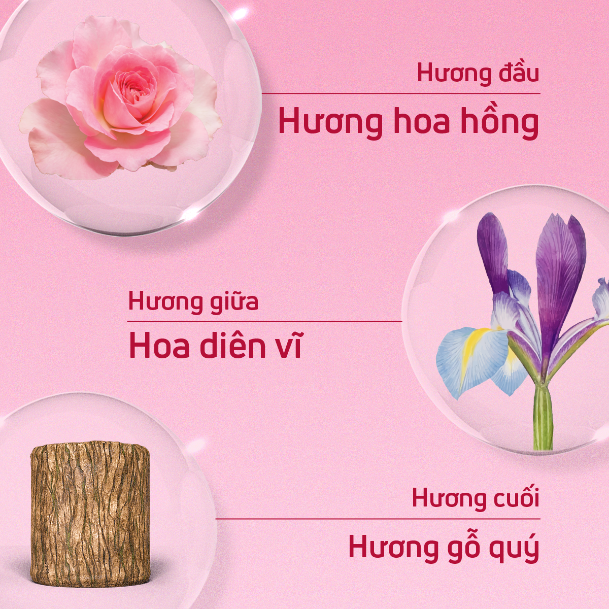 - Hương đầu: Hoa hồng