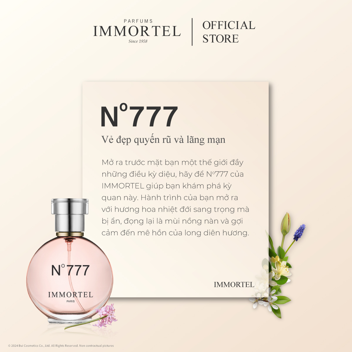 IMMORTEL PARIS ️ Nước hoa IMMORTEL được thành lập từ năm 1958 và là một trong những nhãn hiệu nước hoa nổi tiếng. Ngoài trụ sở chính ở Pháp, IMMORTEL đã có mặt tại Việt Nam và được phân phối độc quyền bởi Bui Cosmetics Co., Ltd. từ 2004 ️ Các sản phẩm nước hoa của IMMORTEL được chọn lọc kĩ lưỡng từ những dòng nước hoa chất lượng trong phòng thí nghiệm của IMMORTEL Paris và được nhập khẩu chính hãng từ Pháp, quê hương của nước hoa  Giới thiệu về Nước Hoa IMMORTEL PARIS N°777:    Vẻ đẹp quyến rũ và lãng mạn: Mở ra trước mặt bạn một thế giới đầy những điều kỳ diệu, hãy để N°777 của IMMORTEL giúp bạn khám phá kỳ quan này. Hành trình của bạn mở ra với hương hoa nhiệt đới sang trọng mà bị ẩn, đọng lại là mùi nồng nàn và gợi cảm đến mê hồn của long diên hương.    Nước hoa IMMORTEL N°777 là một bản giao hưởng với 3 tầng hương: - Hương đầu: Hoa cam, Dạ lan hương, Nho thân gỗ, Eden’s Mist - Hương giữa: Hoa nhài, Hoa lan, Kim ngân hoa, Hoàng liên Nhật - Hương cuối: Hoa mận, Hạt vông vanh, Gỗ Ngựa vằn    Hướng dẫn sử dụng: - Lắc đều, giữ chai cách cơ thể khoảng 15 - 20cm, xịt ở những vùng da tập trung nhiều mạch (cổ tay, sau gáy, ngực) - Không xịt trực tiếp lên quần áo, đồ trang sức - Bảo quản: nơi khô ráo, thoáng mát, tránh ánh nắng trực tiếp và nhiệt độ cao   CAM KẾT: + Sản phẩm do IMMORTEL phân phối là hàng chính hãng 100% + Sản phẩm được sản xuất và đóng gói một cách kỹ lưỡng. Chất lượng đồng đều cho tất cả dung tích + IMMORTEL hoạt động với tiêu chí đặt lợi ích của khách hàng lên hàng đầu, nghiêm túc, trung thực, tận tâm + Hoạt động đa nền tảng, đồng bộ hóa thương hiệu để khách hàng có thể tìm kiếm và liên lạc một cách tiện lợi nhất