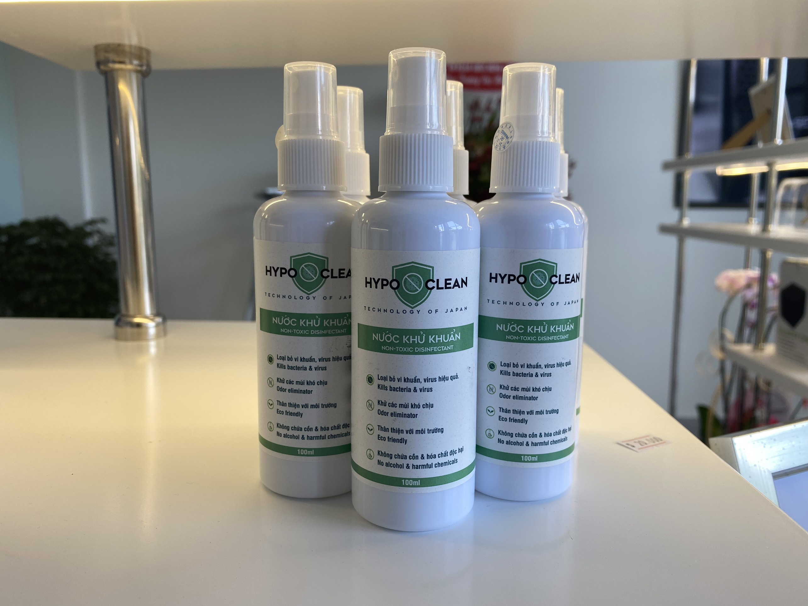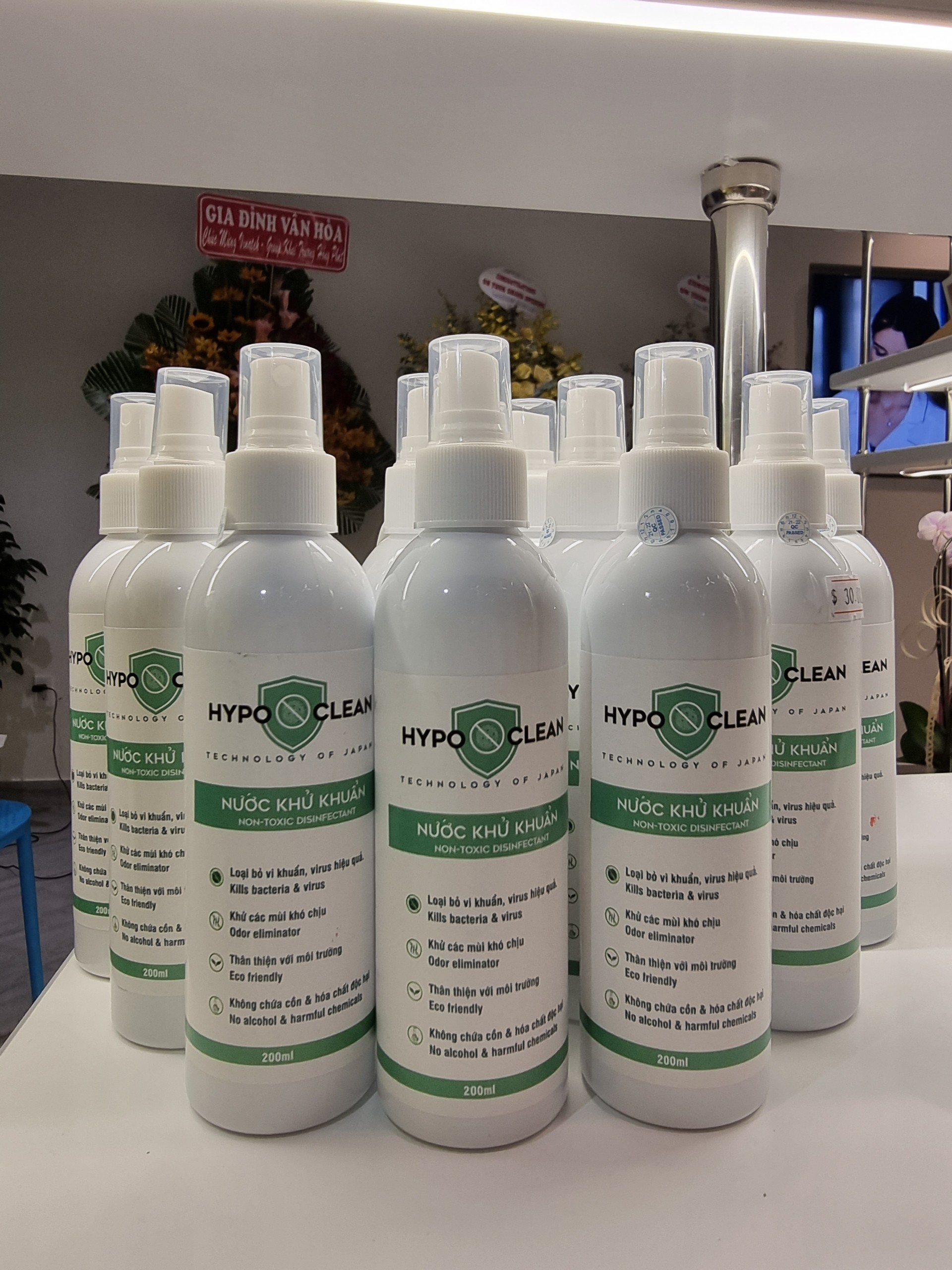 - [ ] Nước khử khuẩn HYPO CLEAN là dung dịch Acid Hypochlorous (HOCI) nồng độ 100ppm, được sản xuất bởi công nghệ diện phân cải tiến của Kanazawa - Nhật Bản từ nước, muối tỉnh khiết, không chứa cồn và các hóa chất độc hại. Dùng dịch Acid Hypochlorous (HOCI) đã được EPA (Cục Bảo vệ Môi trường Hoa Kỳ), NITE (Viện Công nghệ và Đánh giá quốc gia ở Nhật Bản) chứng nhận có khả năng hạn chế virus SARS-CoV-2 hiệu quả; được FDA (Cục quản lý Thực phẩm và Dược phẩm Hoa Kỳ) cho phép sử dụng trực tiếp trên thực phẩm như rau củ, thịt, hải sản. --HYPO CLEAN: phù hợp để khử khuẩn và khử mùi tại văn phòng, nhà ở, siêu thị, trung tâm thương mại, nhà xưởng, nha hàng, khách sạn, thiết bị chế biến thực phẩm, trung tâm Gym, trường học - nhà trẻ, dụng cụ dạy học, đó chơi trẻ em, đồ dùng nhà bếp và trong chế biến sơ chế thực phẩm. — CÔNG DỤNG HƯỚNG DẪN SỬ DỤNG: Khử khuẩn bề mặt: Lau ướt trực tiếp dung dịch lên bề mặt hoặc bình xịt phủ bề mặt cần khử khuẩn. Sau ít nhất 20 giây lau lại bằng khăn khô hoặc có thể để khô tự nhiên. Khứ khuẩn không khí và khử mùi: Phun sương dung dịch với lượng 50ml/m3 vào không gian cần khử khuẩn, khử mùi. —-Trong chế biến thực phẩm: Rửa rau củ, thịt, cá, hải sản với nước sạch. Sau đó ngâm hoặc rửa trực tiếp với dung dịch được pha loãng với nước sạch theo tỷ lệ 1:1 trong vòng ít nhất 20 giây, để ráo hẳn rồi sử dụng để chế biến hoặc đem bảo quản. Sử dụng vệ sinh tay Pha loãng dung dịch với nước sạch theo tỷ lệ 1:1 dùng để rửa hoặc xịt trực tiếp lên tay. Khử 99,9% nấm mốc, vi khuẩn, bào tử vi khuẩn và virus gây bệnh, hiệu quả hơn 80 lần so với nước tấy chlor thông thường. Khử các mùi khó chịu như. mùi ẩm mốc, mùi mồ hôi, mùi Amoniac, => THÀNH PHÂN: Nước tinh khiết, Acid Hypochlorous (HOCI) nồng độ 100ppm =>BẢO QUẢN: Để nơi khô ráo, thoáng mát, tránh ánh nắng mặt trời chiếu trực tiếp. THÔNG TIN CÁNH BẢO AN TOÀN: Để xa tầm với của trẻ em. Sản phẩm không dùng để uống.