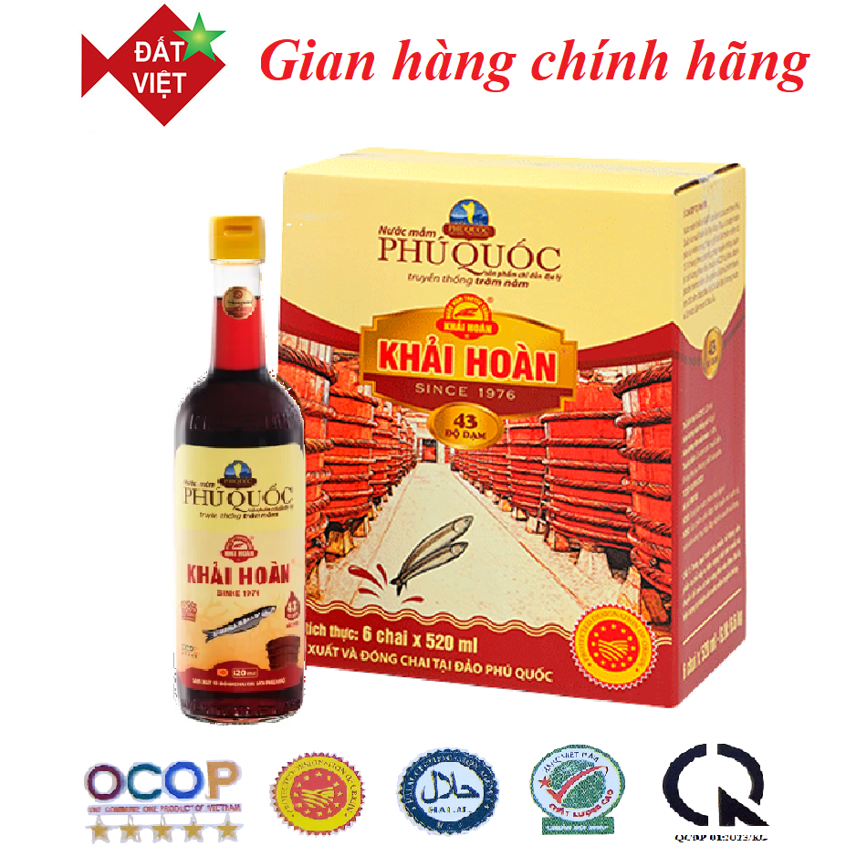 - Bao bì: chai thủy tinh, thùng 6 chai. CHÚ Ý: Trong quá trình bảo quản, sử dụng sản phẩm có thể xảy ra hiện tượng kết tinh muối và chuyển đổi màu từ nâu vàng đến nâu đậm. Đó là hiện tượng tự nhiên của nước mắm truyền thống. Nước mắm Khải Hoàn Phú Quốc: Ủ CHƯỢP TỰ NHIÊN Nước mắm Khải Hoàn Phú Quốc được làm từ cá cơm than Phú Quốc và muối biển Bà Rịa Vũng Tàu, ủ chượp hoàn toàn tự nhiên trong thùng gỗ bời lời thiên nhiên từ 12-15 tháng theo phương pháp truyền thống, quản lý chất lượng theo tiêu chuẩn HACCP từ khâu đánh bắt đến thành phẩm. Sản phẩm có lịch sử hình thành hơn 200 năm, được bảo hộ chỉ dẫn địa lý trong nước và 28 nước Liên Minh Châu Âu. Đặc điểm nhận dạng nước mắm Khải Hoàn Phú Quốc chính hãng Theo quy định Chỉ Dẫn Địa Lý Phú Quốc cho nước mắm, về độ đạm là từ 20-43 độ đạm, có 3 điểm nhận dạng trên chai nước mắm: