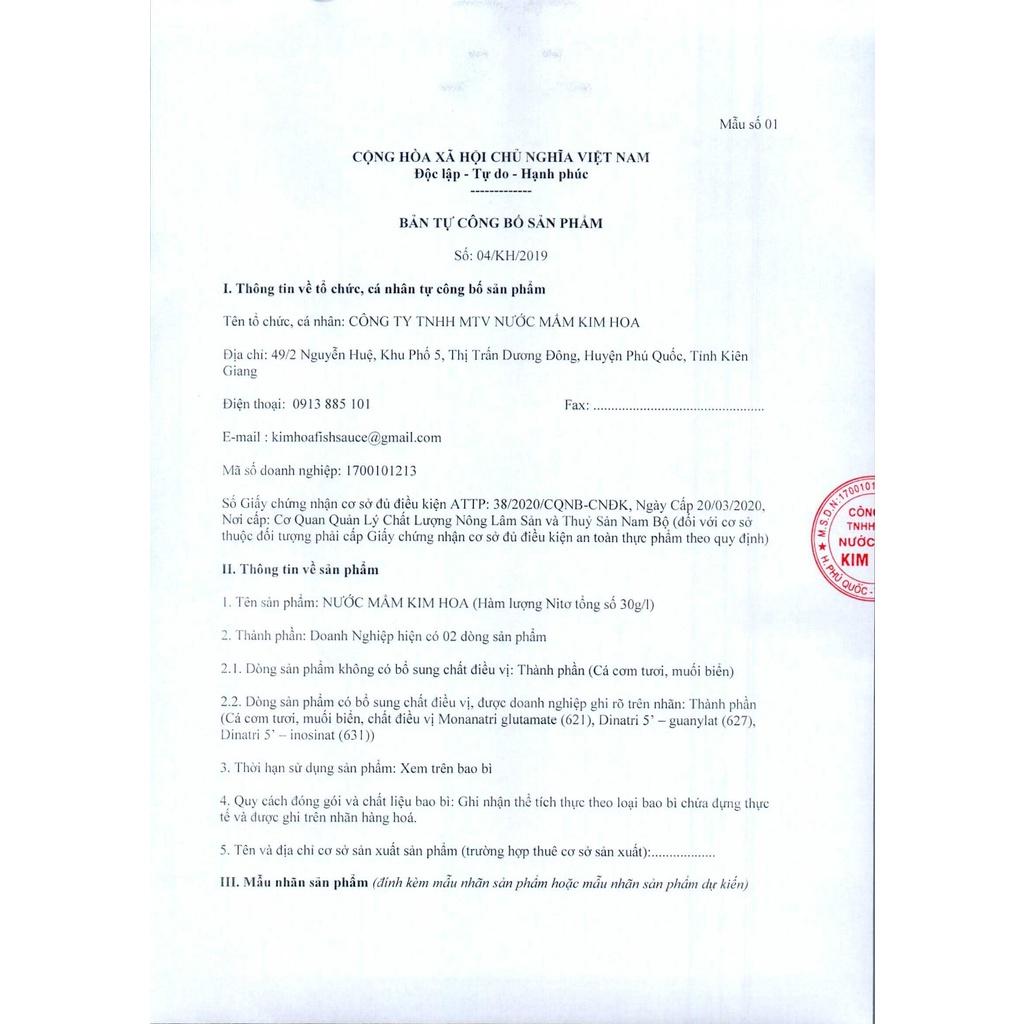 Khác với các loại nước mắm pha chế công nghiệp có sử dụng nhiều chất điều vị và phẩm màu, Nước Mắm Kim Hoa được làm 100% từ Cá Cơm tại vùng đảo Phú Quốc - là loại cá cơm giàu đạm, tươi ngon. Cá cơm sau khi được đánh bắt lên sẽ được ướp ngay trên tàu theo tỷ lệ 3 cá 1 muối, khi thuyền cập bến cá được đưa lên thùng, kiểm tra độ mặn và tiến hành gài nén - ủ chượp trong thùng gỗ đặc trưng. Quá trình này bắt buộc phải từ 12 tháng trở lên, để cá được thuỷ phân hoàn toàn, khi đó nước mắm được kéo rút ra sẽ có màu cánh gián đặc trưng, hương vị đậm đà và cái hậu ngọt của đạm cá được lắng đọng và cảm nhận rõ nơi cuống họng. Chính vì thế, nhiều khách hàng trước có thói quen sử dụng nước mắm công nghiệp khi nếm nước mắm Kim Hoa lần đầu sẽ cảm thấy mặn.