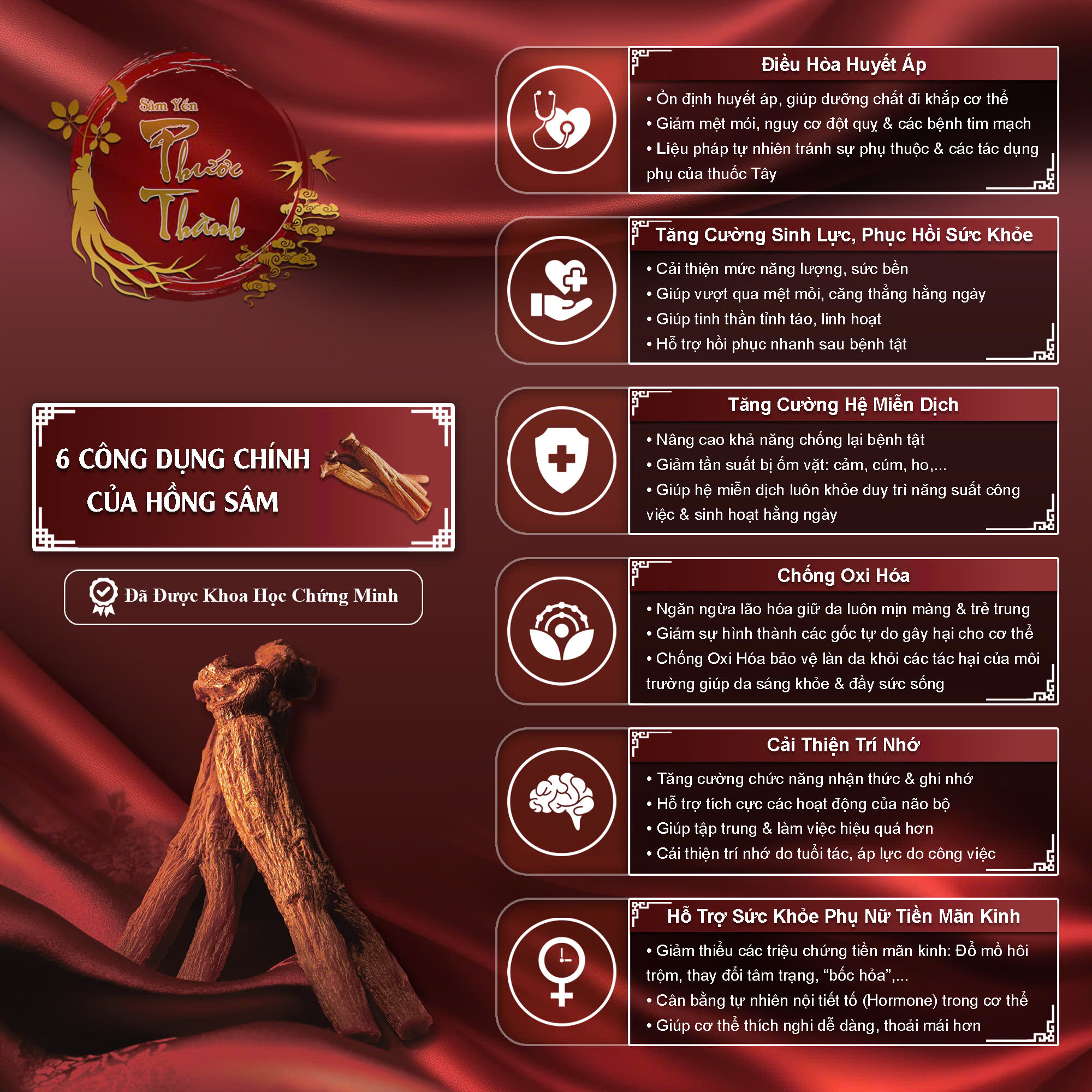 Thành phần của sản phẩm chứa nhiều dưỡng chất tuyệt vời như tinh chất hồng sâm nguyên chất 6 năm tuổi, hoàng kỳ, các loại thảo dược quý, các vitamin nhóm B (B1, B2, B6), vitamin C. Do đó, sản phẩm mang đến rất nhiều lợi ích cho người sử dụng, có thể điểm qua như sau: