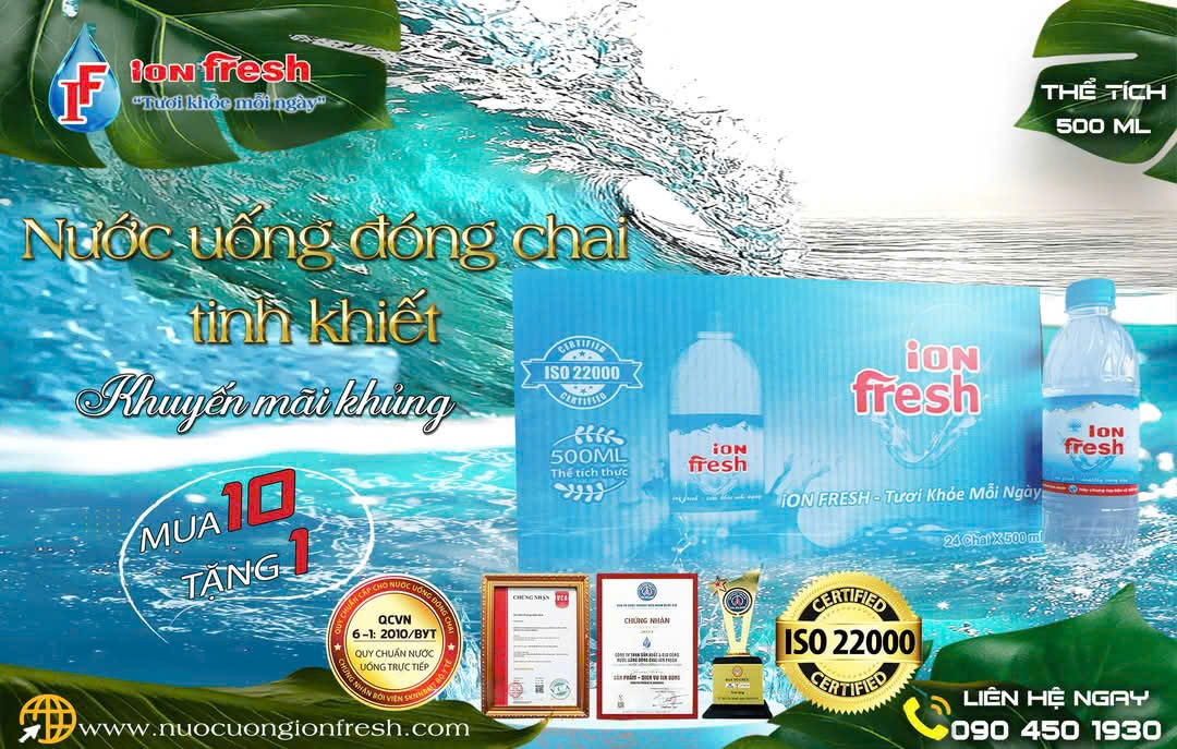 Tên sản phẩm: iON FRESH 500ml - Nước uống đóng chai tinh khiết - iON FRESH 500ml - Quy chuẩn sản xuất được áp dụng: QCVN 6-1: 2010 BYT - Công nghệ xử lý: Khai