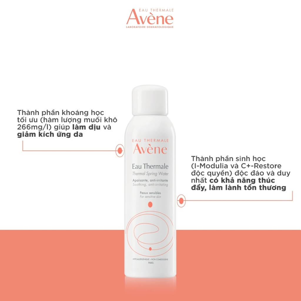 - 100% nước khoáng thiên nhiên Avène, được lấy trực tiếp từ mạch nước ngầm tại nguồn, hoàn toàn tinh khiết.