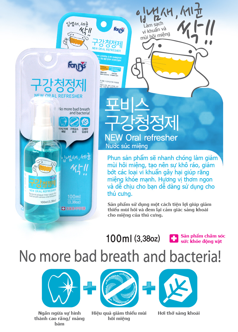 - Nước Xịt Thơm Miệng Cho Thú Cưng Forcans 8809058114736 (100ml) là sản phẩm tiện lợi giúp giảm thiểu mùi hôi và đem lại cảm giác sảng khoái cho miệng của thú cưng - Phun