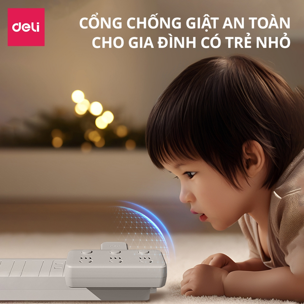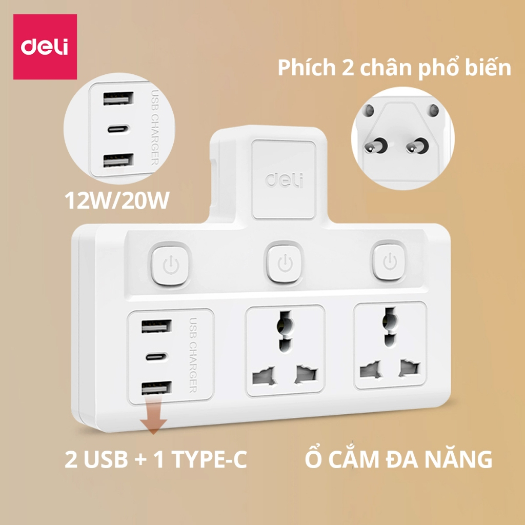 Ổ Cắm Điện Đa Năng Deli - Công suất: 2500W - Cổng USB: 12W - 5V - 2,4A - Bảo hành: 36 tháng - 1 đổi 1 miễn phí trong 30 ngày tính từ ngày