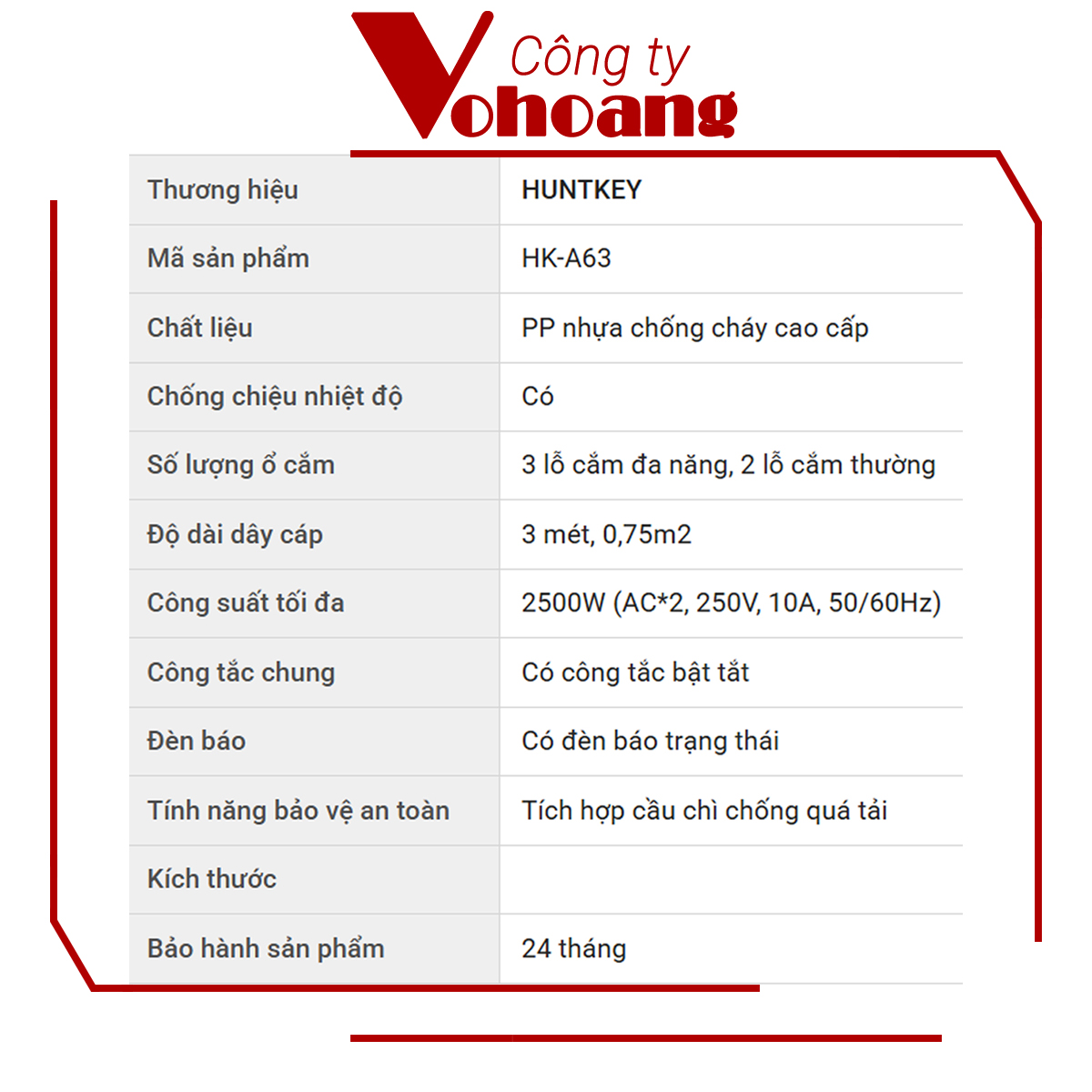 * Đặc tính sản phẩm Chiều dài dây: 3m Kích thước (DxRxC): (270x60x35) mm Khối lượng: 0.4 kg   *Thông số điện Điện áp hoạt động tối đa: 250V Dòng điện ổ cắm tối đa: