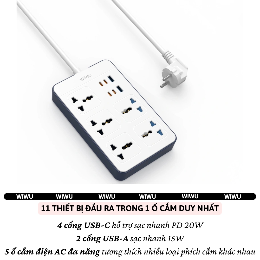Mua tại TiktokỔ Cắm Điện Đa Năng WIWU 11 in 1 – Sạc Nhanh PD 20W, Ổ Cắm 2500W, Dây 2m – Bảo Vệ An Toàn, Tiện Lợi Mọi Nơi WIWU 11 in 1 Power Strip – Tối Ưu Không Gian, Đa Năng Vượt Trội Bạn đang tìm kiếm một ổ cắm điện đa chức năng – gọn gàng – an toàn tuyệt đối? Ổ cắm WIWU 11 in 1 là trợ thủ đắc lực cho gia đình, văn phòng hoặc hành trang du lịch công tác của bạn. Tính Năng Nổi Bật: Tích hợp 11 cổng trong 1: