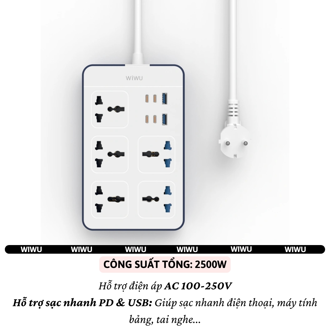 ✨Ổ cắm điện đa năng 11 in 1 2500W WIWU Wi-S006 PS524 4 cổng Type-C (PD 20W), 2 cổng USB-A (2.4A), 5 ổ cắm AC, dây điện dài 2m, Chống cháy, Chip Ai an toàn sạc cho iPhone ipad Macbook Vivo oppo samsung huawei - Hàng nhập khẩu