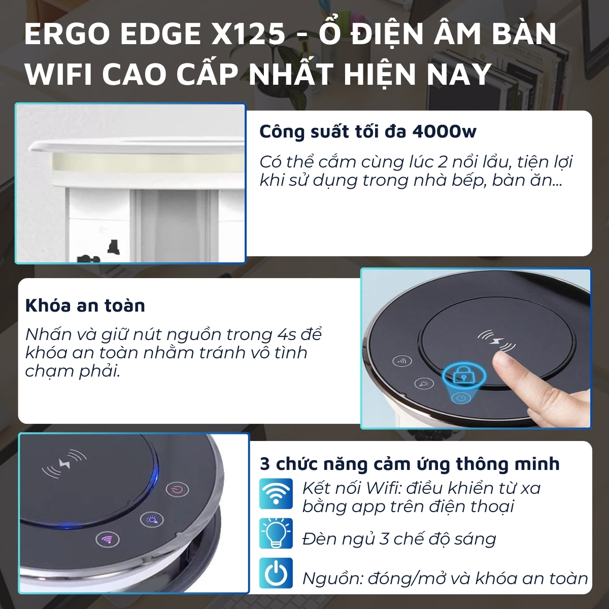 X125, công suất tối đa 4000w: tương tự P110 nhưng cao cấp hơn, có khả năng kết nối qua wifi và khả năng đóng mở bằng 1 chạm – không cần nhấn. Phiên bản ổ điện âm bàn cao cấp nhất, cũng có thể lắp đặt với bàn làm việc, bàn ăn, bàn bếp… - Công suất tối đa của X125 lên đến 4000W, tương đương 2 nồi lẩu.