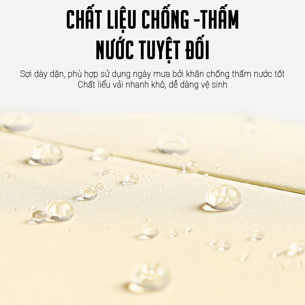 - Chất liệu vải dù 100% không thấm nước, mau khô, dễ vệ sinh, tiện lợi để cất sau khi sử dụng xong.