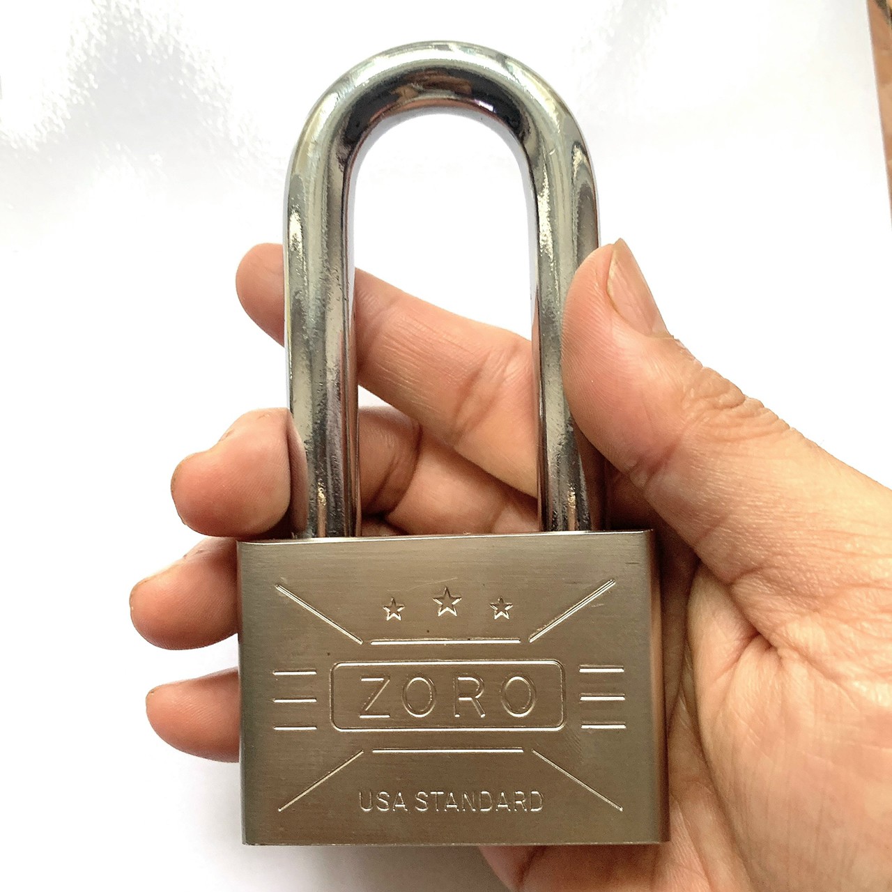 Ổ KHÓA ZORO 6 PHÂN CHÌA MUỖNG CÀNG DÀI • Chất liệu: Hợp kim sắt, lõi đồng thau, chịu lực tốt cứng và chắc Size khóa ngang 6cm cao 12cm, Trọng lượng 450G Kích thước càng dày 12mm , càng cao 7.5cm, độ rộng lồng càng 3cm • Bộ sản phẩm bao gồm 1 ổ và 4 chìa khóa kiểu chìa muỗng Ổ khóa sản xuất theo Công nghệ Mỹ cứng chắc, chống cưa đập đục Ổ khóa với thiết kế nâng cấp càng dài cho nhu cầu các cửa có 2 bát cửa cách xa cần chiều dài càng • Gọng càng khóa làm bằng thép HARDENED (thép cứng đặc chống cưa cắt) đường kính 10mm • Chức năng thông minh : khóa bấm không cần chìa, khóa thao tác dễ dàng, dễ sử dụng