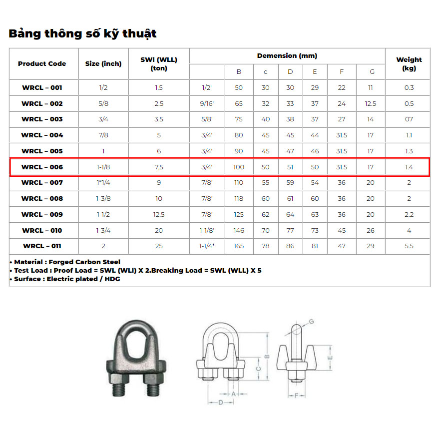 Ốc siết cáp mạ kẽm phi 6 và móc khóa cáp tời quay tay 600LBS-1200LBS, cóc cáp, ốc xiết cáp, Cấu tạo gồm: phần thân có hình dạng chữ U, 1 đầu khóa và 2