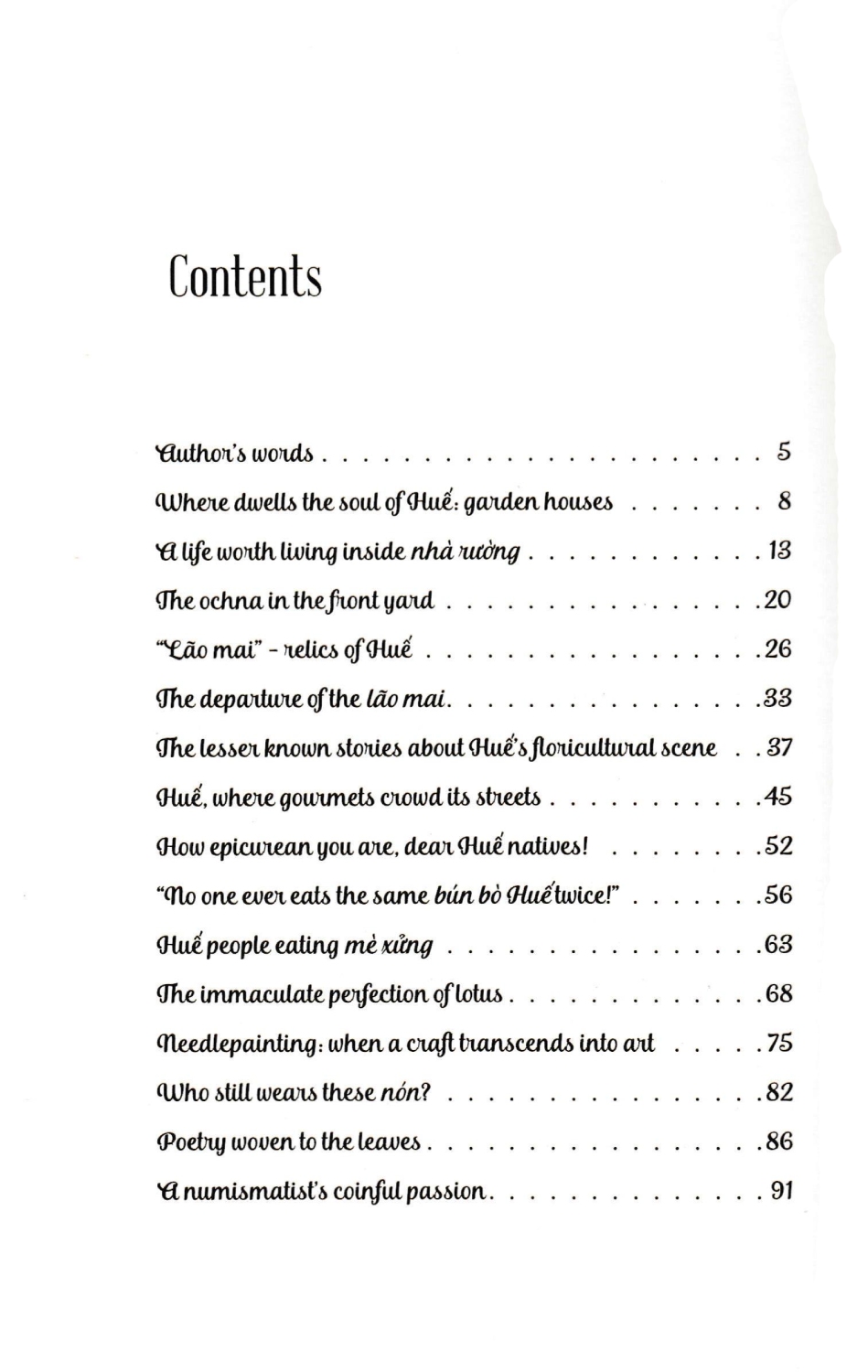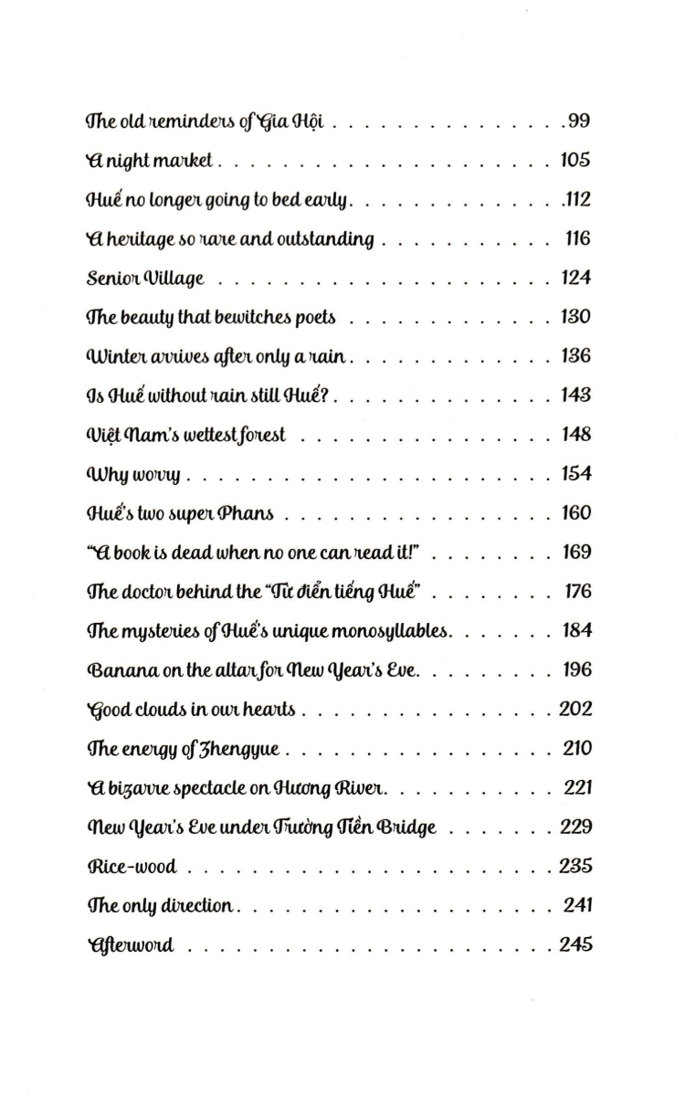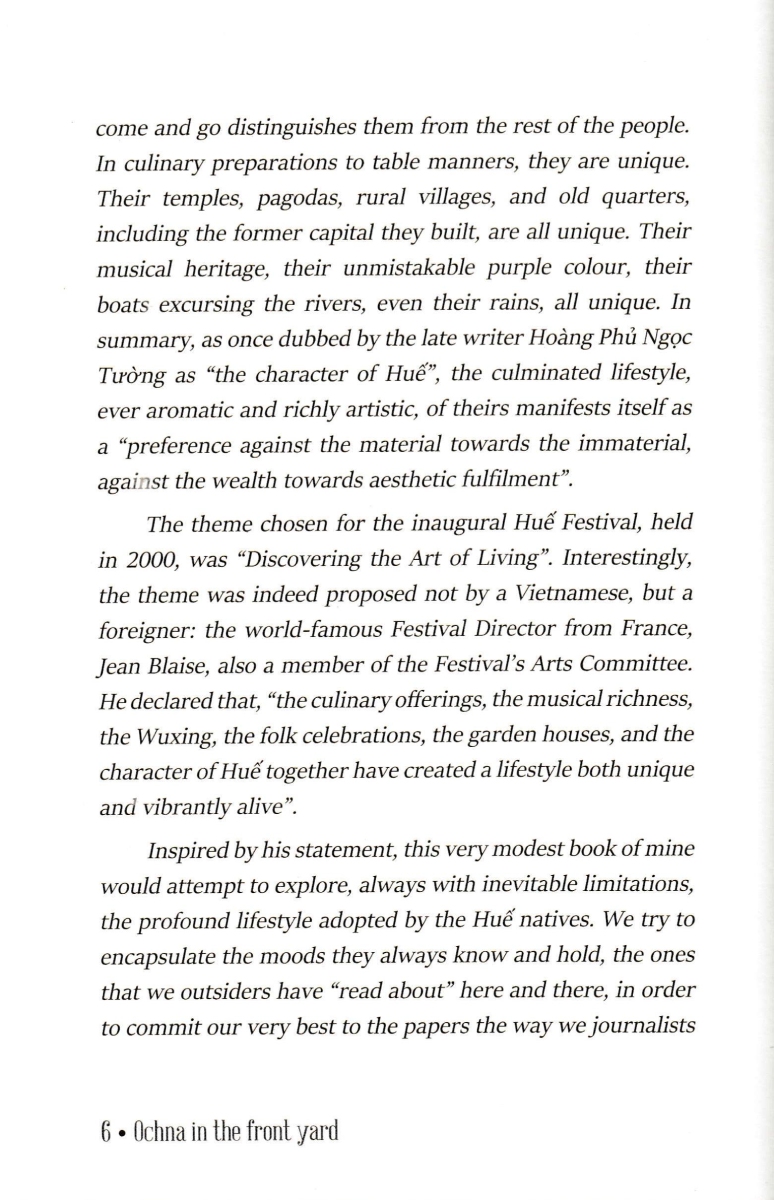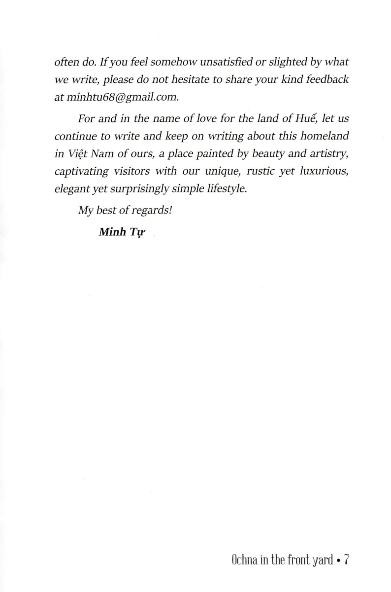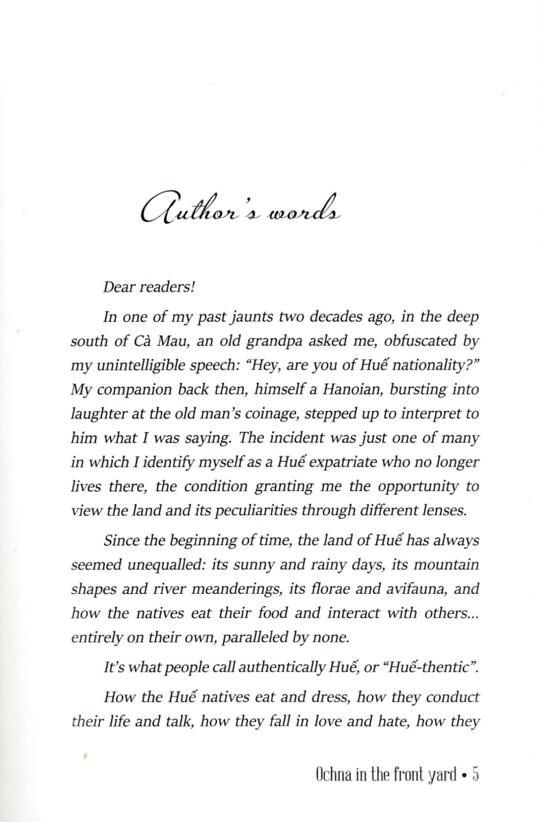 Ochna In The Front Yard - Fascinating Stories About Huế - An Ancient, Poetic And Glamorous Land GIỚI THIỆU SÁCH: Ochna In The Front Yard - Fascinating Stories About Huế - An Ancient, Poetic And Glamorous Land là tập ghi chép về “nước Huế” phong rêu kiêu sa của nhà báo Minh Tự. Hơn ba mươi bài viết của tác giả trong cuốn sách sách hầu hết được viết vào những năm 2000 - 2002, khi anh từ Đà Lạt trở về quê hương sau gần 10 năm tha phương; và trong lần tái bản này, tác giả có cập nhật, chỉnh sửa các bài viết cho hoàn thiện thêm, cùng hình ảnh minh họa sinh động. Tập ghi chép đã khắc họa đậm nét văn hóa, lối sống của người Huế dưới các góc nhìn khác nhau, từ chuyện ăn theo lối Huế, chuyện cơm hến, mè xửng, tô bún bò đến đường kim mũi chỉ, vành nón bài thơ, gốc mai lão trượng hay phiên chợ khuya, mà với tác giả, đó là “lối Huế”. Chia sẻ về đứa con tinh thần của mình, tác giả Minh Tự nói: “Những tháng năm tôi được làm một người Huế sống ngoài Huế, và nhờ vậy mới hiểu rõ hơn, một cách khách quan hơn, về bản sắc riêng biệt của xứ sở nà Cuốn sách này xin cùng khám phá nghệ thuật sống của người Huế, dù không thể nói hết muôn màu muôn vẻ của ‘lối Huế’. Nó chỉ là những trạng thái của Huế được chúng tôi ‘đọc’ được và thuật lại bằng cách của một người viết báo.”