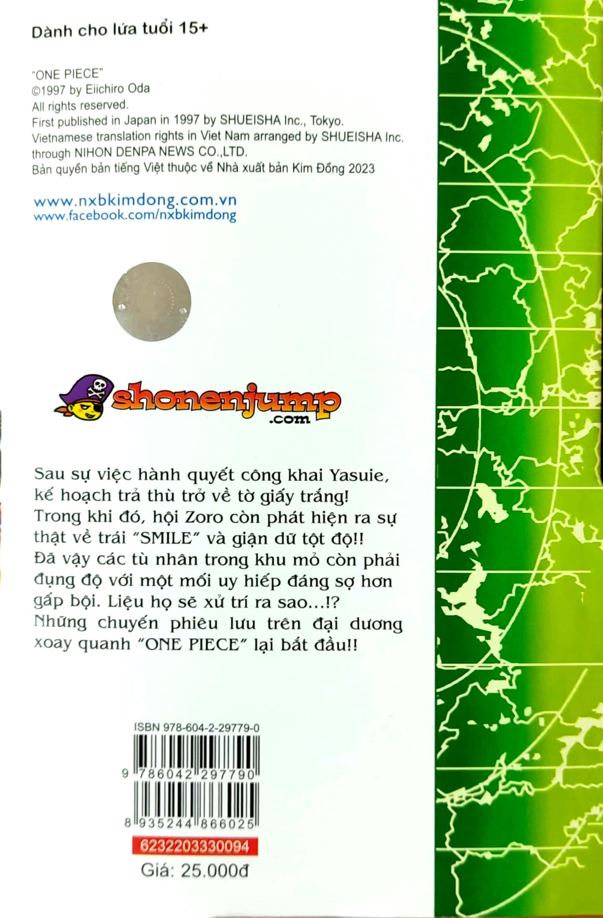 Sau sự việc hành quyết công khai Yasuie kế hoạch trả thù trở về tờ giấy trắng! Trong khi đó, hội Zoro còn phát hiện ra sự thật về trái “SMILE” và giận dữ tột độ!! Đã vậy các tù nhân trong khu mỏ còn phải đụng độ với một mối uy hiếp đáng sợ hơn gấp bội. Liệu họ sẽ xử trí ra !? Những chuyến phiêu liêu trên đại dương xoay quanh “ONE PIECE” lại bắt đầu!!