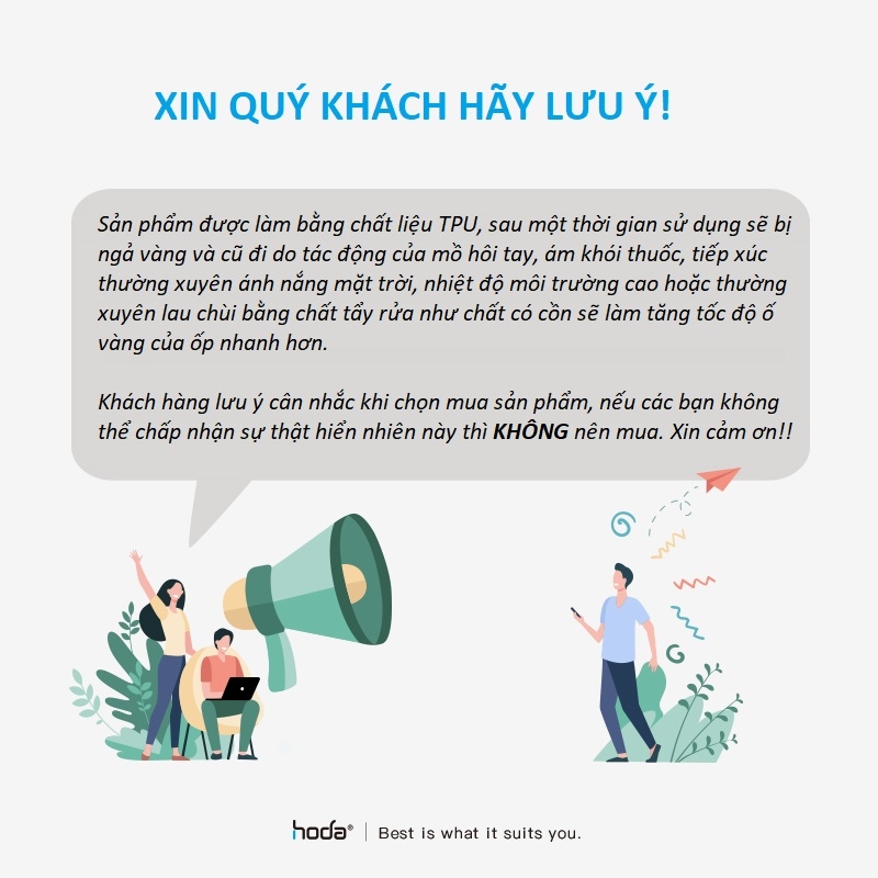 Ốp TPU sẽ ngả màu và cũ đi do vật liệu và cách sử dụng hằng ngày. Ốp bị ố vàng theo thời gian sử dụng là điều chắc chắn.