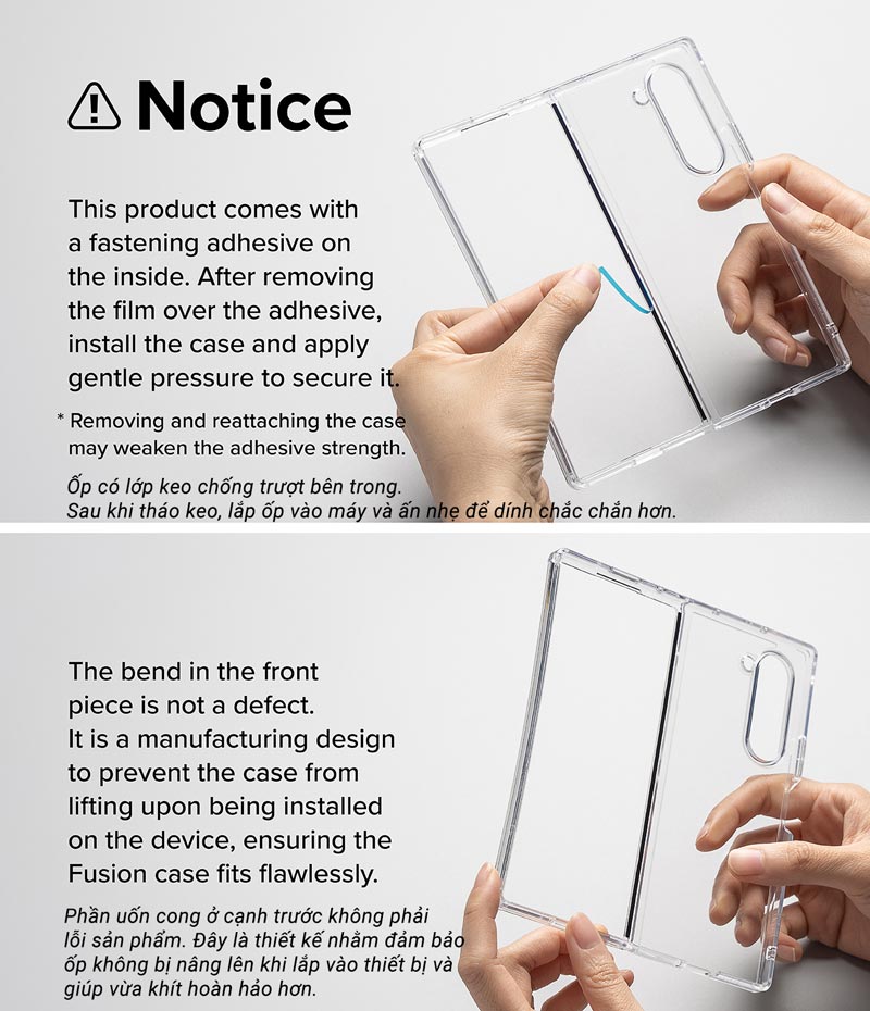 • Ốp có lớp keo chống trượt ở cạnh bên trong, sau khi tháo lớp phim, lắp ốp vào máy và ấn nhẹ để dính chắc chắn hơn. Lưu ý: tháo và lắp ốp nhiều lần có thể làm giảm độ kính của lớp keo này.