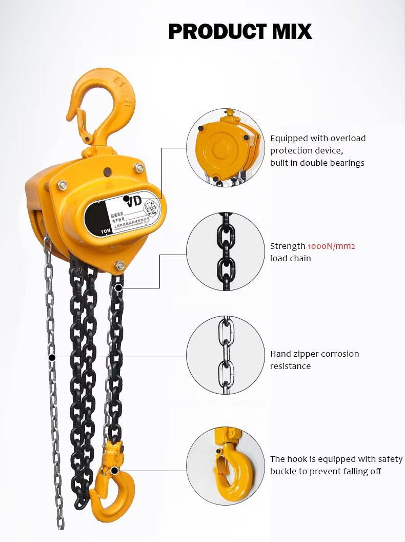 - Giữ sạch bề mặt ma sát của phanh. Cơ cấu phanh nên được kiểm tra thường xuyên để ngăn ngừa sự cố phanh và giảm tải. THÂN HÌNH Kết cấu thép chịu lực, chịu va đập cao Hộp số và nắp bánh xe chắc chắn Thiết kế nhỏ gọn cho không gian trên đầu thấp và tính di động BẢO VỆ QUÁ TẢI Thiết bị ly hợp trượt ngăn không cho tời nâng tải trọng gây hư hỏng vượt quá công suất định mức XÍCH TẢI Thép hợp kim mangan được xử lý nhiệt có khả năng chống mài mòn và hao mòn Bộ dẫn hướng xích thép chịu lực cao Nâng tiêu chuẩn: 10' hoặc 20' BÁNH RĂNG Bộ truyền động giảm tốc kép đòi hỏi rất ít nỗ lực để vận hành Xử lý nhiệt cảm ứng và tôi cứng Được bao bọc để bảo vệ khỏi bụi và nước MÓC Móc thép hợp kim được rèn, xử lý nhiệt mở ra dần dần mà không bị gãy khi chịu tải quá mức Móc trên và dưới có chốt móc chịu lực nặng HOẠT ĐỘNG Vận hành bằng xích tay Giảm sự mệt mỏi của người vận hành thông qua hệ thống truyền động hiệu quả PHANH Lò xo chốt đôi cho hoạt động cực kỳ đáng tin cậy và kích hoạt phanh tức thì TÙY CHỌN Hộp đựng xích để giữ xích sạch sẽ và không vướng víu Xích chống ăn mòn cho môi trường ăn mòn Móc kiểm tra Chiều dài nâng tùy chỉnh theo yêu cầu của bạn