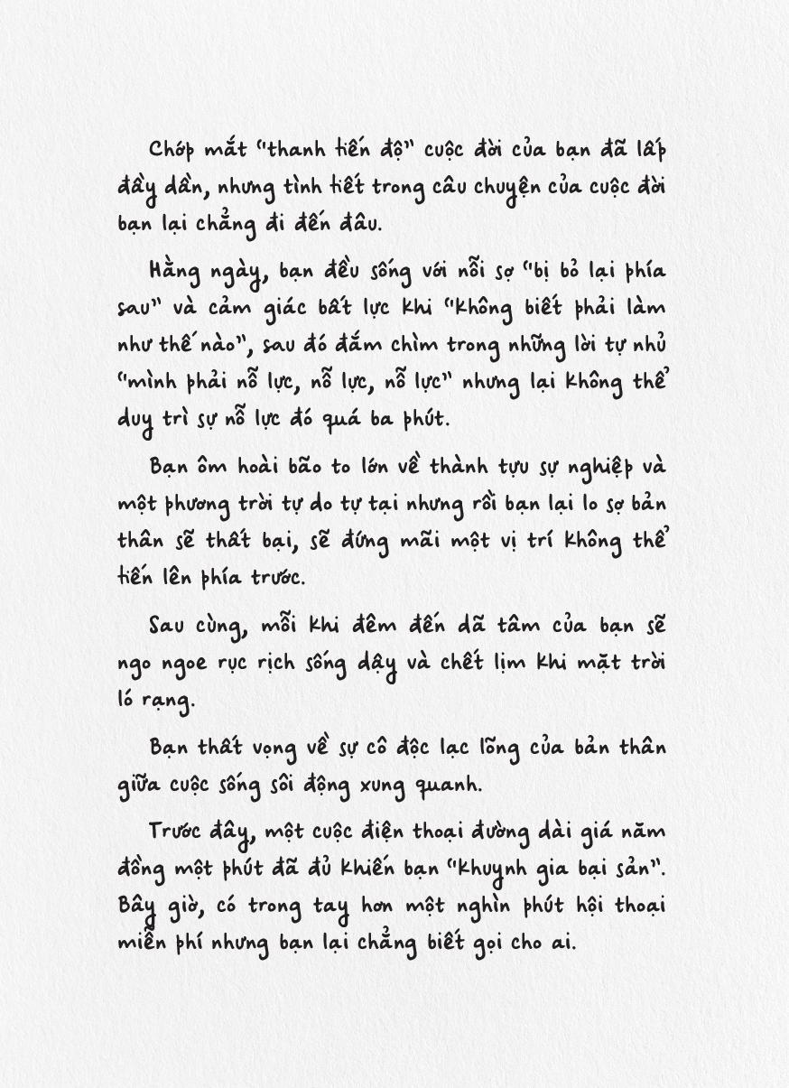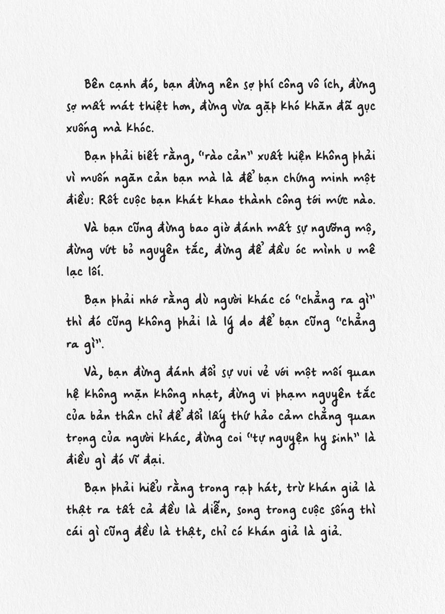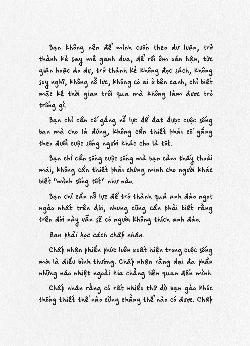 Hy vọng cuốn sách nhỏ này sẽ trở thành người đồng hành cùng bạn trong hành trình trưởng thành đầy rẫy những gian nan - nhưng cũng biết bao điều kỳ thú. Mỗi khi thấy nản chí hay mỏi mệt, hãy mở một trang sách bất kỳ, nhâm nhi từng dòng để cảm thấy trái tim của bạn được ôm ấp, vỗ về.
