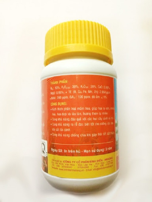 Thành phần: N: 10 %, P2O5: 30 %, K2O: 20 %, CaO: 0.05 %, MgO: 0.05 %, TE (B, Cu, Fe, Mn, Zn): 2050 ppm, NAA: 200 ppm, GA3: 100 ppm.