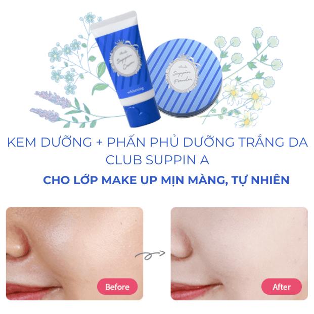 - Phấn phủ dưỡng da Club Suppin A là sản phẩm 2 in 1 vừa trang điểm vừa giúp dưỡng trắng da, cụ thể sản phẩm có công dụng: Che phủ khuyết điểm trên da, đồng thời giúp cung cấp độ ẩm cho da, dưỡng da trắng sáng, mịn màng. Được khuyên kết hợp với Kem dưỡng trắng da Club Suppin A để tăng hiệu quả make up, dưỡng da cũng như mang lại cho bạn vẻ ngoài tự nhiên, rạng rỡ hơn. Dành cho da thâm sạm, xỉn màu, tàn nhang. ƯU ĐIỂM NỔI BẬT