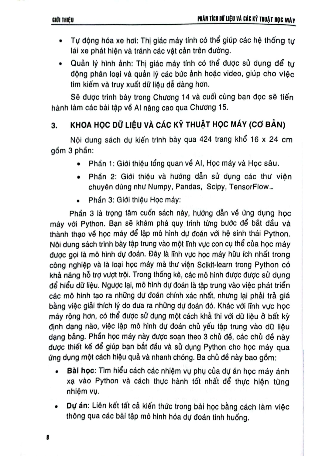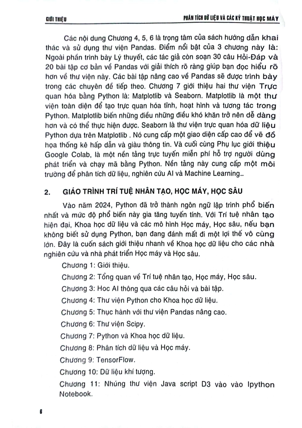 Phân Tích Dữ Liệu Và Các Kỹ Thuật Học Máy Có thể xem đây là tập tiếp theo sách KHOA HỌC DỮ LIỆU VỚI CÁC KỸ THUẬT HỌC MÁY (CƠ BẢN) ở mức độ chuyên sâu giới thiệu các công cụ Toán như Thống Kê, Đại số tuyến tính, Lý thuyết cơ bản về học máy, Cách thức các thuật toán học máy cụ thể hoạt động và nhiều hơn nữa mà các sinh viên chuyên ngành học về môn học này cần được trang bị. Sách giới thiệu nhanh về các thành phần thiết yếu của ngôn ngữ Python dành cho các nhà nghiên cứu và nhà phát triển Phân tích dữ liệu, học máy và học sâu. Nền tảng học máy vững chắc được trình bày bởi chuyên gia. Toàn bộ vòng đời phát triển học máy được áp dụng cho các dự án cấp doanh nghiệp. Bao gồm mã hóa Python, điện toán khoa học, thuật toán tối ưu hóa, AI có thể giải thích và các phương pháp tiên tiến hướng đến sự đơn giản, khả năng mở rộng, khả năng tái sử dụng, khả năng nhân rộng, triển khai nhanh và bảo trì dễ dàng. Từ làm sạch dữ liệu đến thiết kế mô hình, thử nghiệm và lựa chọn tính năng, cho đến những hình ảnh trực quan tuyệt vời dễ dàng cho các bên liên quan và người ra quyết định. Tùy thuộc vào nền tảng và sở thích của sinh viên, các chủ đề có thể bao gồm dữ liệu tăng cường, mô hình tổng quát và hỗn hợp, dữ liệu lớn, mạng thần kinh sâu, Nhiều thuật toán học máy được trình bày. Nội dung sách trình bày qua 440 trang khổ 16 x 24 cm với 12 chương. Chương 1: Làm quen với Python và thư viện. Chương 2: Tổng quan về Trí tuệ nhân tạo, Khoa học dữ liệu, Học máy và Học sâu. Chương 3: Thống kê. Chương 4: Đại số tuyến tính. Chương 5: Trực quan hóa dữ liệu. Chương 6: Truy xuất, xử lý và lưu trữ dữ liệu. Chương 7: Làm sạch dữ liệu. Chương 8: Xử lý tín hiệu và chuỗi thời gian. Chương 9: Học có giám sát – Phân tích hồi quy. Chương 10: Học có giám sát – Các kỹ thuật phân loại. Chương 11: Học không giám sát – Pca và phân cụm. Chương 12: Phân tích dữ liệu dạng văn bản.