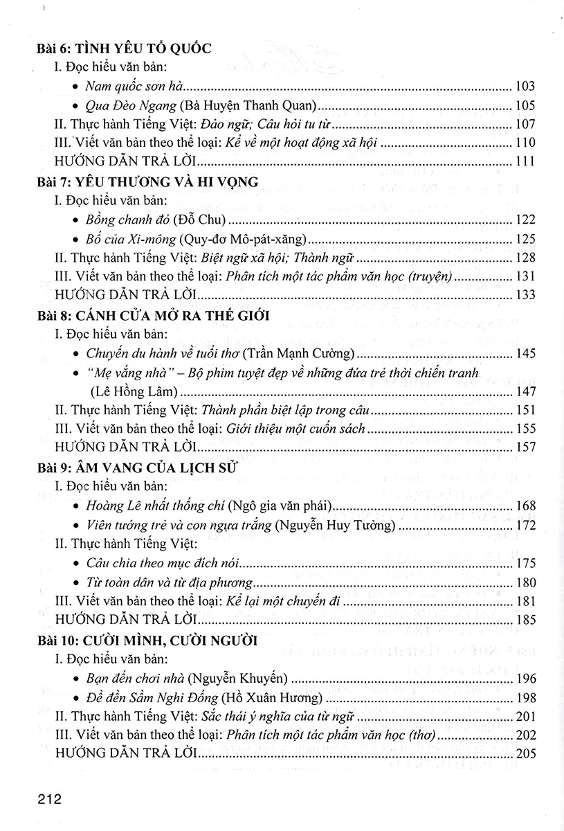 - Viết văn bản theo thể loại: Hướng dẫn học sinh các thao tác để viết được văn bản theo đúng thể loại mà bài học yêu cầu: từ hướng dẫn lựa chọn đề tài, xác định mục đích viết, chuẩn bị tư liệu cho bài viết đến hướng dẫn tìm ý và lập dàn ý, viết bài và chỉnh sửa bài viết thông qua bảng kiểm và nhận diện các lỗi thường mắc của học sinh. – Phần hai: Hướng dẫn trả lời Phần này, cuốn sách đưa ra các gợi ý, hướng dẫn, tư liệu tham khảo, các thao tác để học sinh tự trả lời các câu hỏi và bài tập ở phần một nhằm phát triển năng lực ngôn ngữ và tư duy ở người học. Nhiều câu hỏi học sinh có thể tự trả lời theo hiểu biết và quan điểm cá nhân, khuyến khích sự độc lập suy nghĩ và sáng tạo.