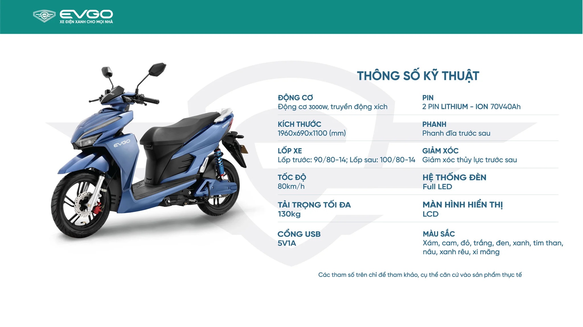 GIÁ XE NIÊM YẾT: 44,900,000 VNĐ - GIÁ XE CHƯA BAO GỒM PIN Đặt cọc xe trị giá 5Trđ + Miễn phí giao hàng + Tặng kèm Mũ bảo hiểm & áo phông EVGO. Nhận xe trong tháng 8/2023. Liên hệ: XE MÁY ĐIỆN EVGO để biết thêm thông tin chi tiết.