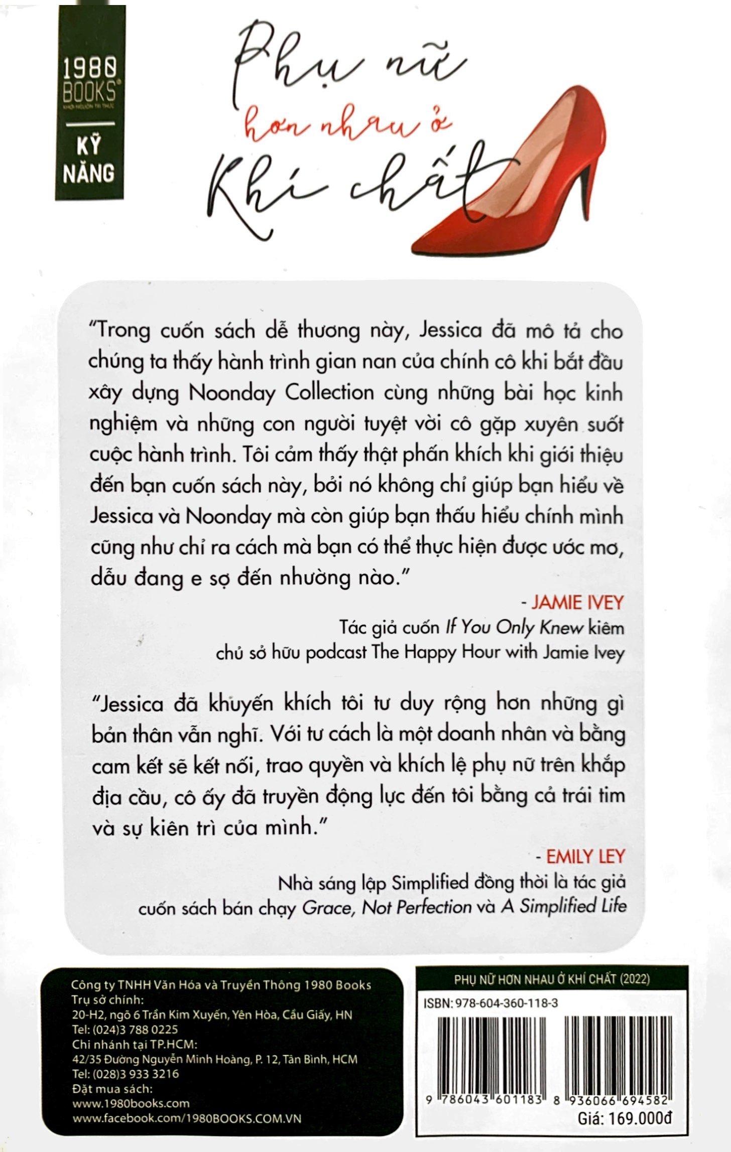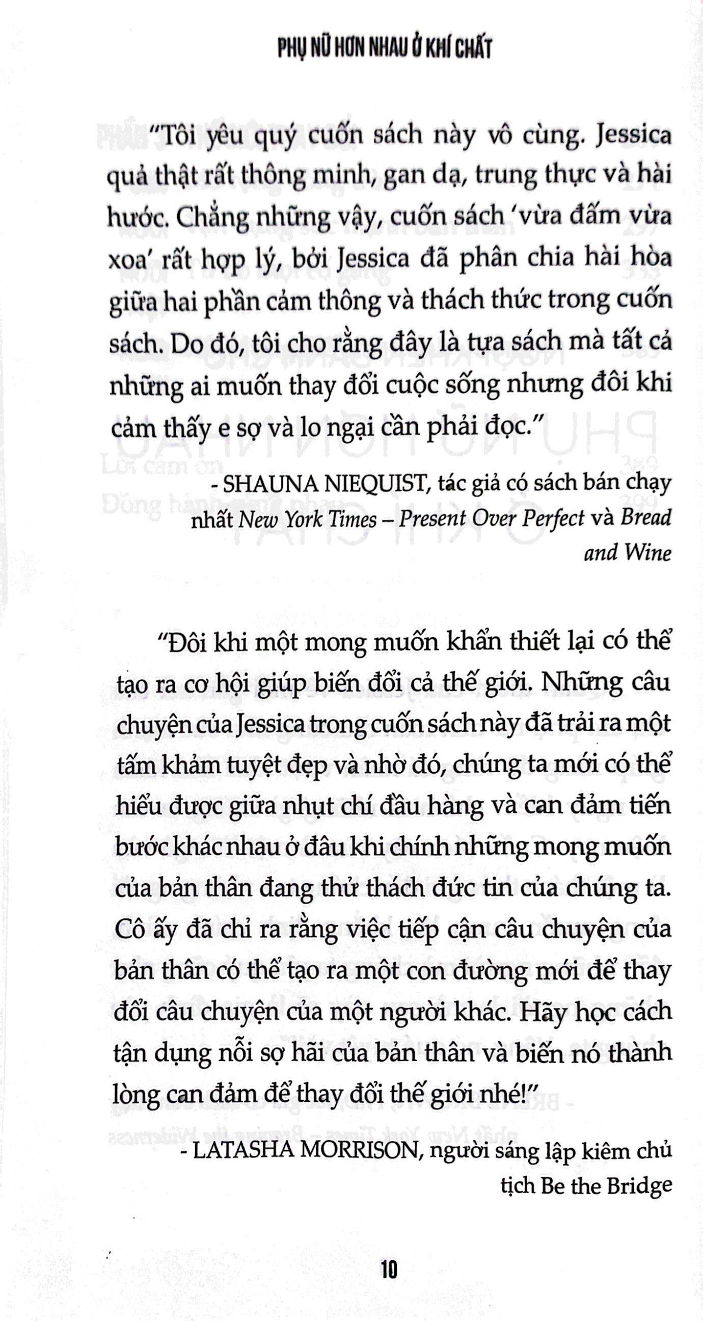 “Chúng ta có thể chọn cách tin tưởng giá trị của mình, bất kể tóc bạn dày hay mỏng, bất kể da bạn sáng hay tối màu, bất kể bạn thích trang điểm đậm hay theo đuổi vẻ tự nhiên. Chúng ta có giá trị bởi vì chúng ta đang tồn tại!” Với cuốn sách Phụ Nữ Hơn Nhau Ở Khí Chất, tác giả Jessica giúp người đọc thấu hiểu chính mình cũng như chỉ ra cách mà bạn có thể thực hiện ước mơ, dẫu đang e sợ đến nhường nào.