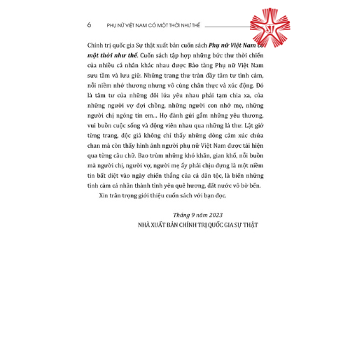 Cuốn sách Phụ nữ Việt Nam có một thời như thế do Nhà xuất bản Chính trị quốc gia Sự thật xuất bản, phát hành, tuyển chọn, tập hợp từ những kỷ vật lưu giữ là hàng nghìn lá thư được viết trong thời kỳ d...