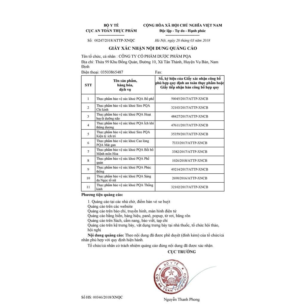 - Địa chỉ sản xuất: Công ty Cổ phần Dược phẩm PQA. Thửa 99, Khu Đồng Quàn, Xã Tân Thành, Huyện Vụ Bản, Tỉnh Nam Định. THÀNH PHẦN: