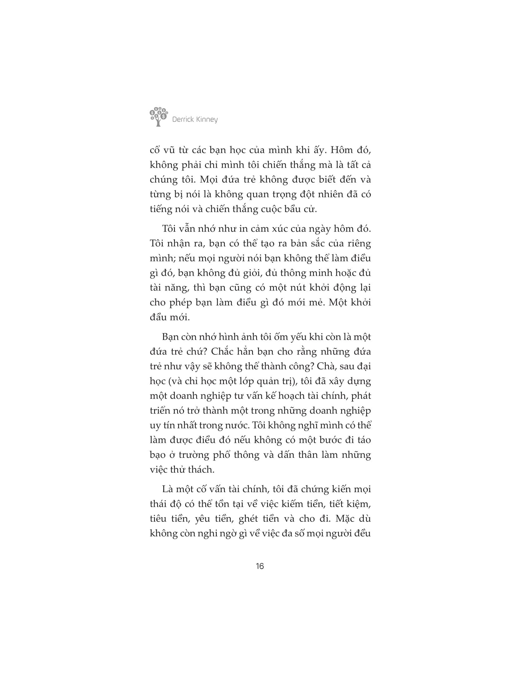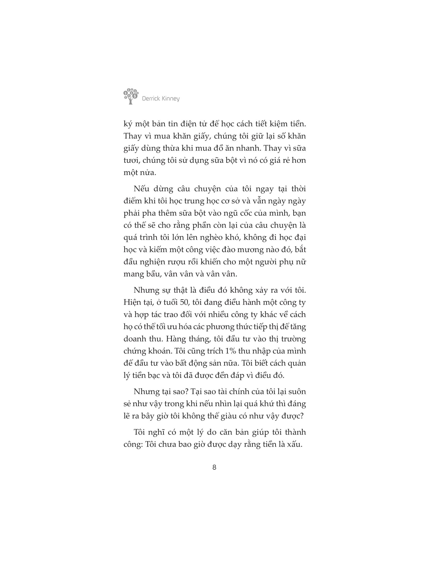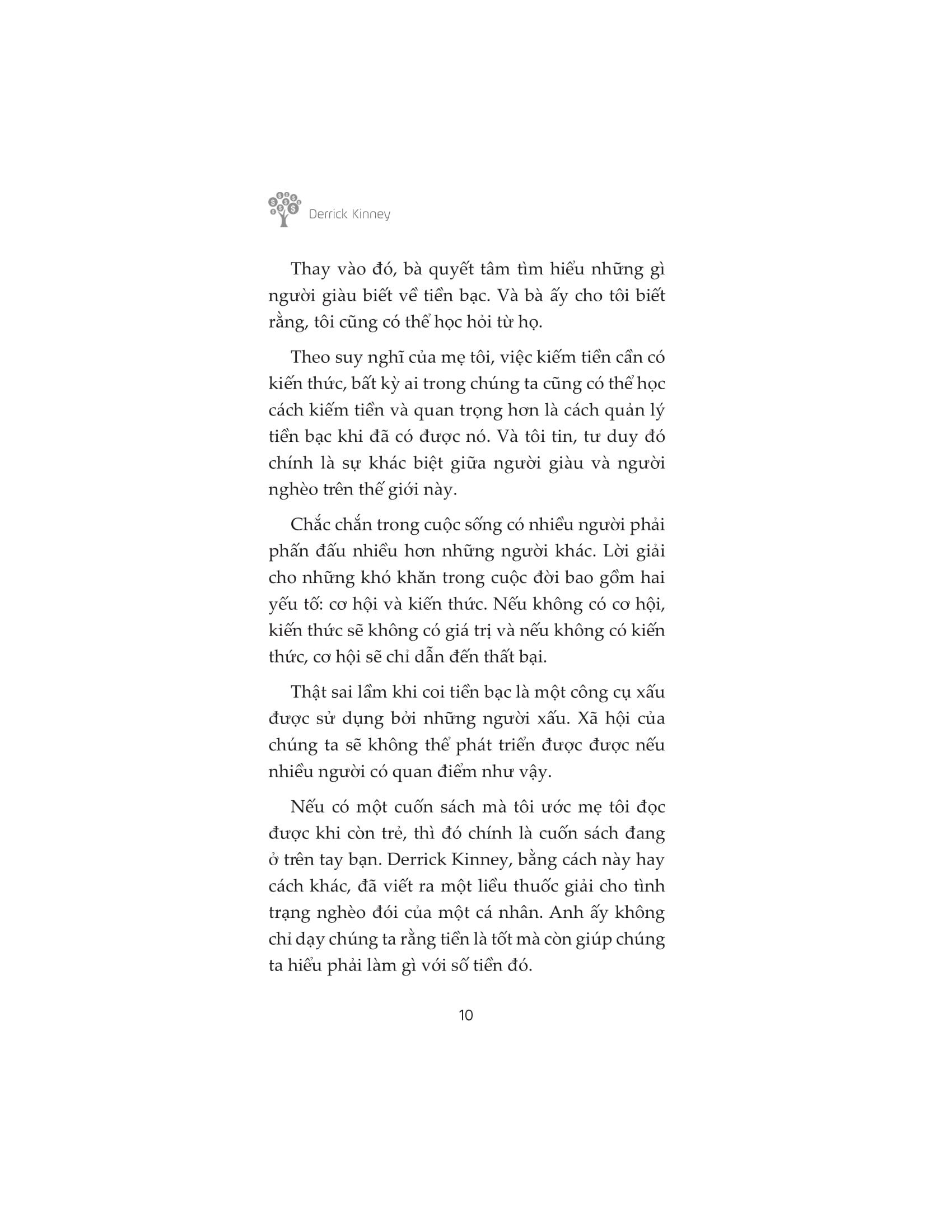 “Derrick Kinney đã tạo ra hướng dẫn cơ bản về cách kiếm tiền, tiết kiệm tiền, đầu tư và cho đi nhiều tiền hơn. Với những câu chuyện hài hước và lập luận sắc bén, cuốn sách như một bản đồ kho báu giúp ta tìm thấy sự tự do tài chính, đồng thời tạo ra những tác động tích cực đến thế giới”. - Lara Casey, Giám đốc điều hành của tổ chức Cultivate What Matters