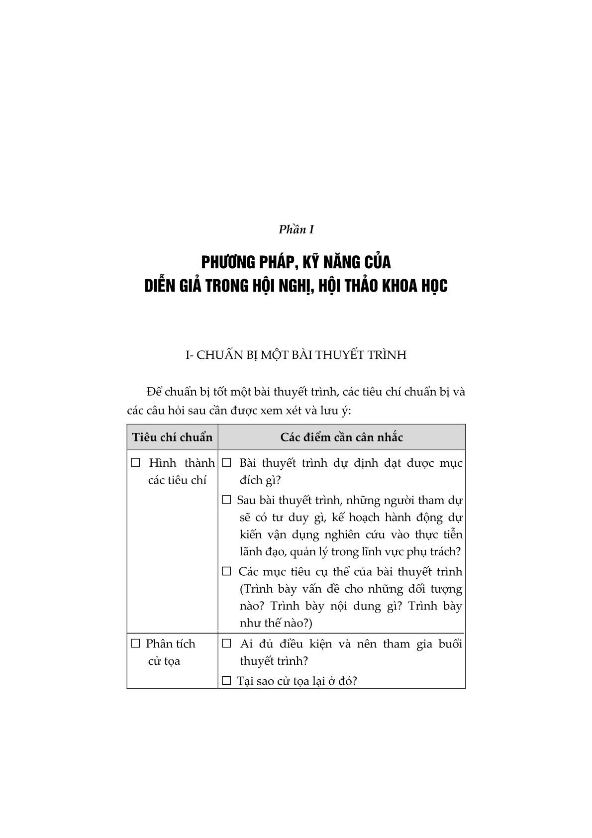 Đây là cuốn sách đầu tiên ở Việt Nam giới thiệu về phương pháp, kỹ năng và một số kinh nghiệm thực tiễn khi chủ trì, tham dự hội nghị, hội thảo khoa học. Nội dung cuốn sách sẽ cung cấp cho bạn đọc những phương pháp, kỹ năng của diễn giả trong hội nghị, hội thảo khoa học; kỹ năng, kinh nghiệm chủ trì một hội nghị, hội thảo khoa học; kỹ thuật trình bày PowerPoint trong hội nghị, hội thảo khoa học để đạt được hiệu quả cao nhất. Ngoài ra, Phần phụ lục của cuốn sách còn giới thiệu thêm về phương pháp, kỹ năng chuẩn bị, điều hành các cuộc họp, viết báo cáo; giới thiệu phương pháp luận đồng hợp Malik, một phương pháp hiện đại giúp nâng cao hiệu quả công việc. sig Nội dung cuốn sách đề cập đến một lĩnh vực còn khá mới mẻ, chưa có nhiều nghiên cứu, nên mặc dù các tác giả đã dày công sưu tầm, tuyển chọn từ các tài liệu trên thế giới, cũng như chắt lọc kinh nghiệm thực tế từ chính bản thân, tuy vậy cuốn sách khó tránh khỏi hạn chế, rất mong nhận được ý kiến đóng góp của bạn đọc để nội dung cuốn sách được hoàn thiện hơn trong lần xuất bản tiếp theo.