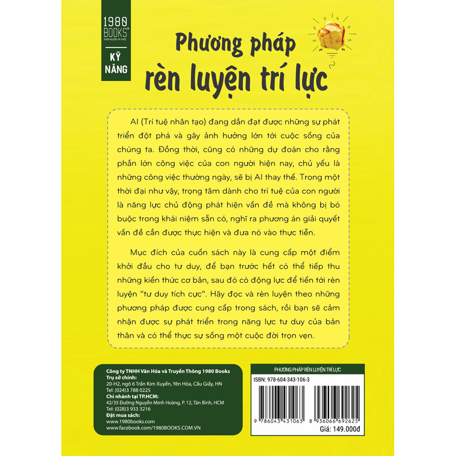 AI (Trí tuệ nhân tạo) đang dần đạt được những sự phát triển đột phá và gây ảnh hưởng lớn tới cuộc sống của chúng ta. Đồng thời, cũng có những dự đoán cho rằng phần lớn công việc của con người hiện nay, chủ yếu là những công việc thường ngày, sẽ bị AI thay thế. Trong một thời đại như vậy, trọng tâm dành cho trí tuệ của con người là năng lực chủ động phát hiện vấn đề mà không bị bó buộc trong khái niệm sẵn có, nghĩ ra phương án giải quyết vấn đề cần được thực hiện và đưa nó vào thực tiễn. Mục đích của cuốn sách này là cung cấp một điểm khởi đầu cho tư duy, để bạn trước hết có thể tiếp thu những kiến thức cơ bản, sau đó có động lực để tiến tới rèn luyện “tư duy tích cực”. Hãy đọc và rèn luyện theo những phương pháp được cung cấp trong sách, rồi bạn sẽ cảm nhận được sự phát triển trong năng lực tư duy của bản thân và có thể thực sự sống một cuộc đời trọn vẹn. =>>Trích dẫn hay trong cuốn sách: