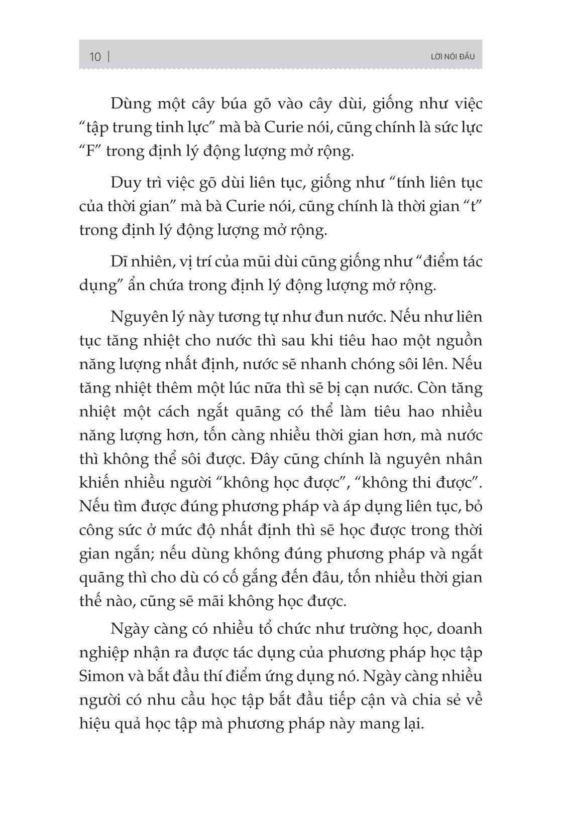 Trong cuốn “Phương pháp Simon - Cách học nhanh, nhớ lâu mọi kiến thức” đã chia sẻ những cách tiếp cận học tập đúng đắn, giúp người đọc có thể tập trung và hiểu được nội dung bài học một cách nhanh chóng hơn, từ cách xây dựng lộ trình học tập, quản lý thời gian cho đến cách nghiên cứu và đánh giá bài kiểm tra, tác giả đều cung cấp cho độc giả những gợi ý và phương pháp thực tiễn bám sát với thực tế chia nhỏ các kiến thức thành các “Chunking” (những điểm kiến thức) khác nhau để dễ dàng ghi nhớ