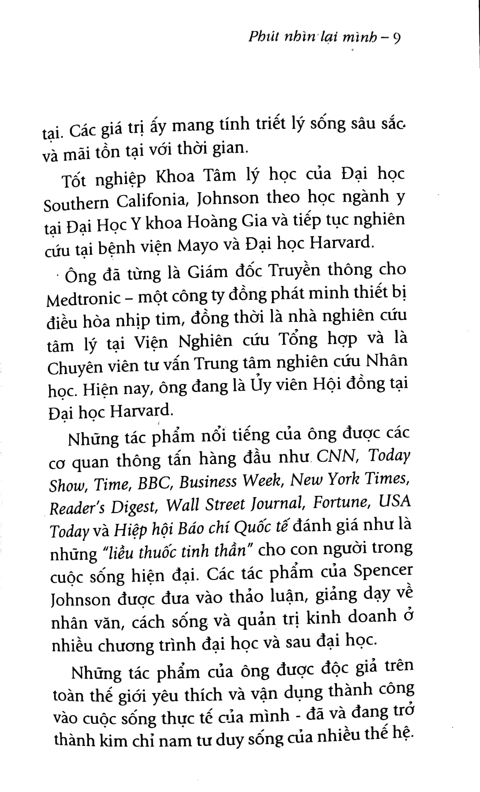 Cuốn sách nổi tiếng của Spencer Johnson với cách nhìn mới và rất giản dị nhưng thực sự có thể làm thay đổi cuộc sống của bạn, giúp bạn vượt qua những khó khăn thử thách và trên hết là tránh lãng phí sức lực và thời gian trong cuộc hành trình đi tìm chính mình. Đây là một cách tư duy có giá trị như một chân lý rất cần thiết cho cuộc sống hiện tại của chúng ta. Khi thành công và hạnh phúc cuộc sống có lúc mâu thuẫn với nhau. Khi áp lực công việc và những lo toan, những nghịch cảnh, những suy nghĩ đa chiều đã khiến chúng ta di chuyển quá nhanh trong cuộc sống. Để rồi đến một lúc chúng ta thực sự muốn tìm lại được sự thanh thản của tâm hồn, tìm được sự tĩnh lặng của nội tâm, giúp chúng ta khơi gợi cảm hứng và sức mạnh tiềm ẩn để tìm được hạnh phúc trong tình yêu, ý nghĩa, niềm vui của cuộc sống và thành công trong công việc.