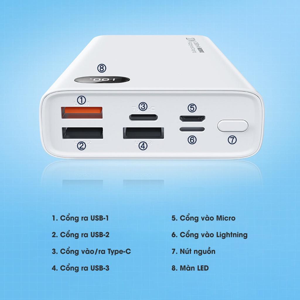 Ưu điểm nổi bật - Dung lượng lớn đến 20.000 mAh – đủ cung cấp nhiều lần sạc cho smartphone, tablet. - Hỗ trợ sạc nhanh 22.5 W – giúp thiết bị được sạc nhanh