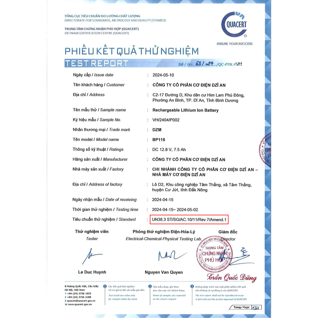 Pin khởi động DZM được kiểm soát chất lượng nghiêm ngặt theo quy trình ISO9001. Pin khởi động DZM được chứng nhận an toàn theo Tiêu chuẩn UN38.3 (tiêu chuẩn xuất khẩu vào thị trường USA) Hãy xem UN38.3 thử nghiệm những gì: - T1: áp suất thấp 11.6kPa tương đương bay ở độ cao 15km - T2: nhiêt độ thay đổi 10 chu kì từ +72C tới -40C tức là các điều kiện cực đoan nhất - T3: rung - T4: sốc (thả rơi) ..
