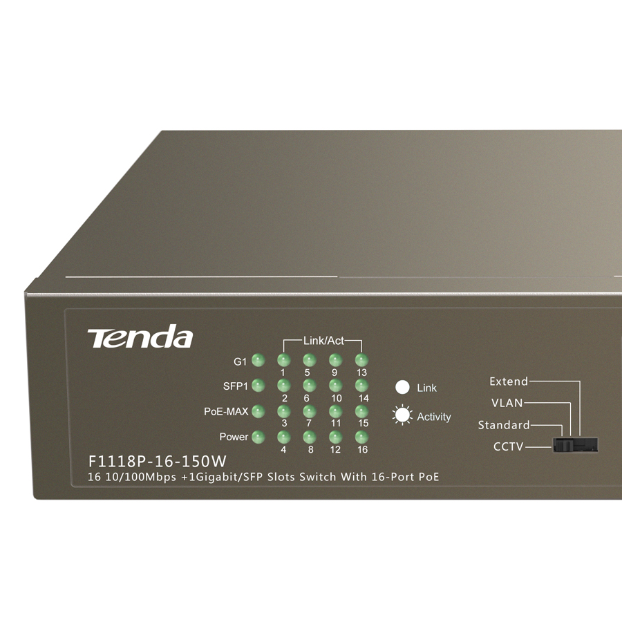 Bộ chia mạng Tenda TEF1118P cũng cung cấp các chế độ quản lý đơn giản như CCTV, VLAN và Extend để giúp giảm chi phí cáp của các thiết bị đầu cuối IP như AP và IP camera.