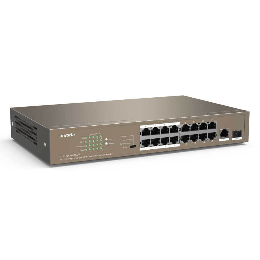 PoE Switch Tenda TEF1118P Thiết kế đặc biệt nhằm cung cấp giải pháp đơn giản để mở rộng mạng SMB và mạng campus với chi phí tiết kiệm nhất, với 16 cổng PoE được trang bị 18 cổng mạng với cổng 1-16 tuân thủ chuẩn IEEE 802.3at/af.
