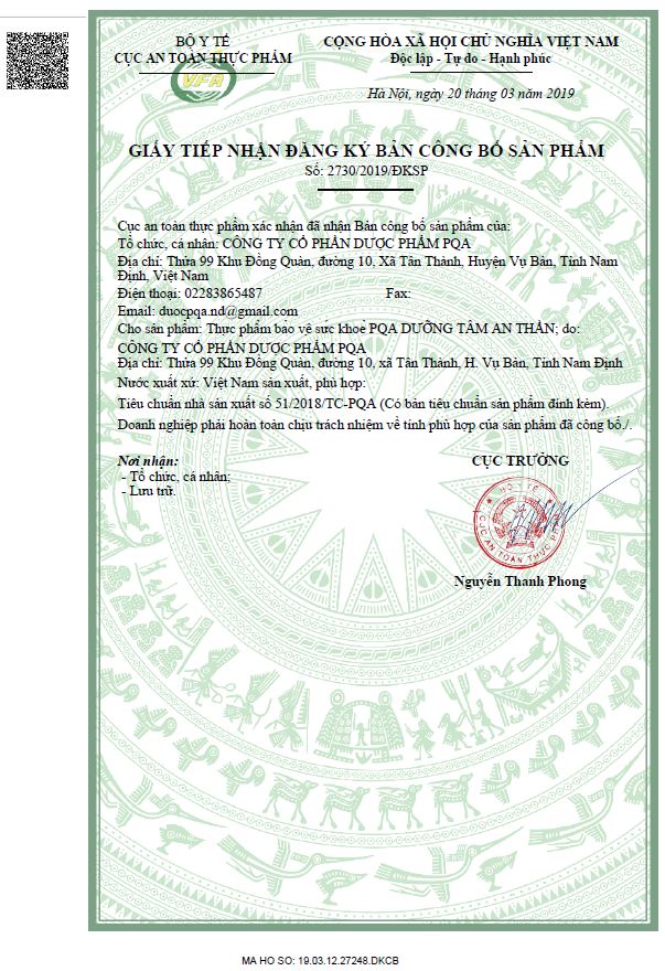PQA Dưỡng Tâm An Thần là dược phẩm hỗ trợ dưỡng tâm, an thần, giúp tạo giấc ngủ ngon, ngủ sâu giấc cho người bị suy nhược thần kinh, mất ngủ, giấc ngủ đến chậm, hoặc không sâu giấc.   Thành phần Cho  viên 400mg cao tương đương với thảo mộc Lạc tiên: 2,0g Lá vông: 1,3g Lá dâu tằm: 0,4g Liên tâm: 0,3g Phụ liệu vừa đủ. Công dụng: Hỗ trợ dưỡng tâm, an thần, giúp tạo giấc ngủ ngon, ngủ sâu giấc. Đối tượng sử dụng: Người bị suy nhược thần kinh, mất ngủ, giấc ngủ đến chậm, hoặc không sâu giấc. Cách dùng: Ngày uống 2 lần, 1 lần trước khi ăn tối và 1 lần trước khi đi ngủ. Trẻ em trên 12 tuổi: Uống 1 – 2 viên/ lần Người lớn: Uống 2 – 3 viên/ lần. Mỗi đợt dùng 3 tháng. Nên dùng 2 – 3 đợt. Cảnh báo về sức khỏe: Không dùng cho phụ nữ có thai, không sử dụng cho người đang vận hành máy móc, tàu xe, người mẫn cảm với bất kỳ thành phần nào của sản phẩm này. Hạn sử dụng 36 tháng kể từ ngày sản xuất. Hạn sử dụng in trên bao bì. Bảo quản Nơi khô mát, tránh ánh nắng trực tiếp. Thực phẩm này không phải là thuốc, không có tác dụng thay thế thuốc chữa bệnh. Tham khảo ý kiến thầy thuốc trước khi dùng. Số XNQC: 01765/2019/ATTP-XNQC Số đăng ký: 2730/2019/ĐKSP
