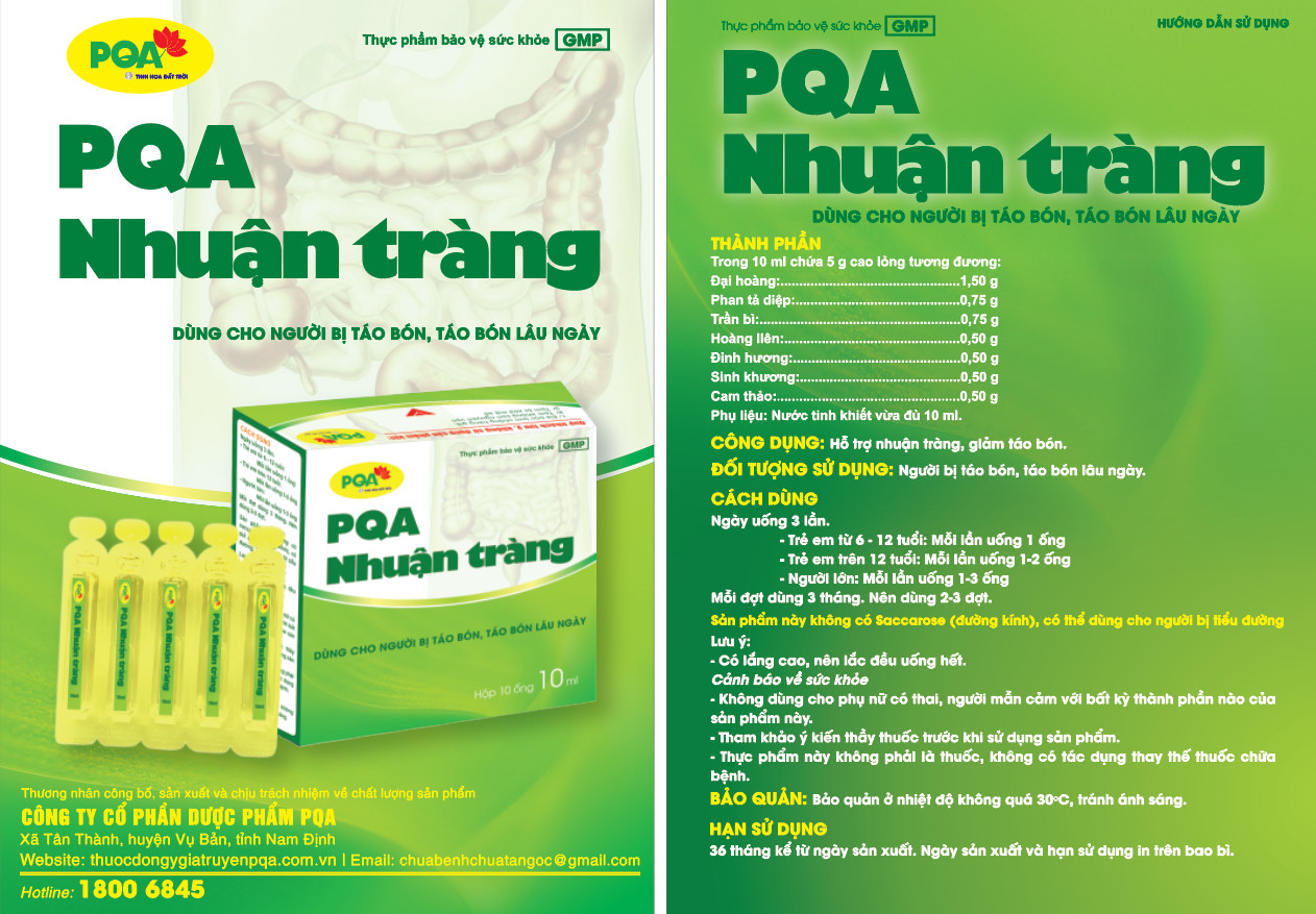 THÔNG TIN PQA NHUẬN TRÀNG DẠNG ỐNG PQA Nhuận Tràng dạng ống là dược phẩm thảo dược có tác dụng nhuận tràng dùng cho người lớn và trẻ em trên 6 tuổi bị táo bón, táo