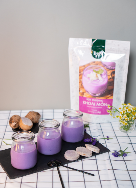 Thành phần: bột kem béo thực vật, bột sữa, đường tinh luyện, bột khoai môn, hương khoai môn, chất làm dày (INS 410, INS 407), chất chống đông vón (INS 551), màu thực phẩm (INS 102, INS 113). ****Cách sử dụng bột Pudding khoai môn Déli**** - Đun nước chờ đến khi sôi. - Trộn đều hỗn hợp bột pudding và đường rồi cho hỗn hợp vào nước sôi, khuấy đều cho tan hỗn hợp trong 3-5 phút, tắt bếp và vớt bọt trên mặt. - Rót dung dịch đã nấu ra khuôn, để nguội và cho vào tủ mát chờ pudding đông lại. Bảo quản: thoáng mát, tráng tiếp xúc trực tiếp ánh nắng mặt trời. Đóng kín miệng túi sau khi sử dụng. Hạn sử dụng: 18 tháng kể từ ngày sản xuất.