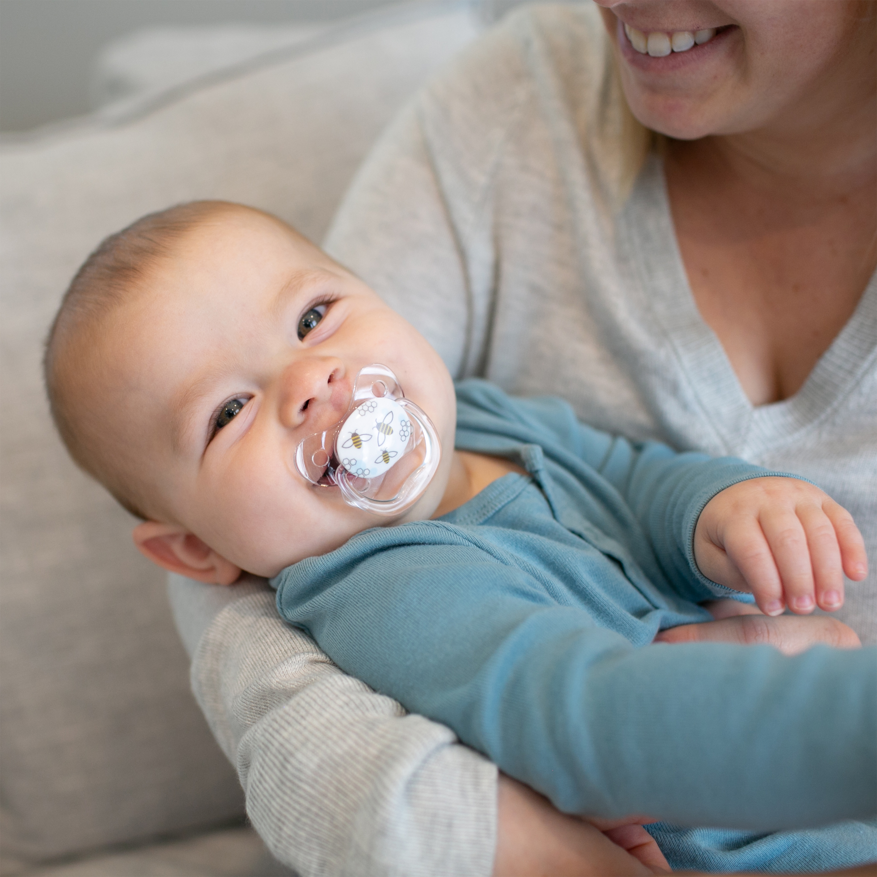 - Nhiều khe hở trên mặt cong cho phép không khí lưu thông để giảm thiểu khả năng bé thiếu dưỡng khí, chống đột tử khi bé ngậm trong lúc ngủ ( nước bọt sẽ đi từ khe hở xuống cuống họng, làm cho bé nuốt nước bọt, giúp duy trì được cơ chế đường hô hấp )