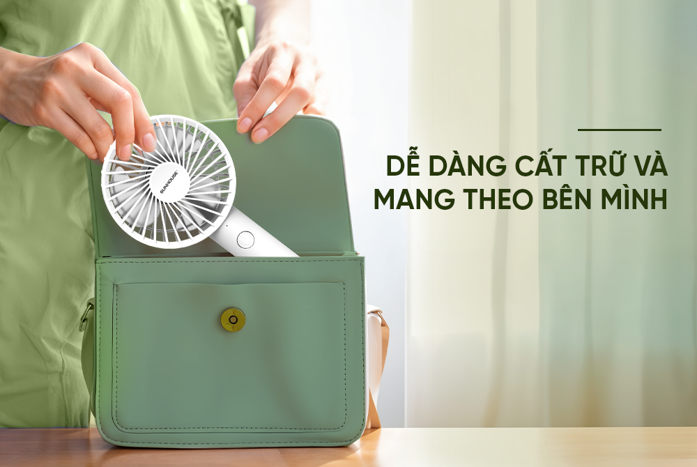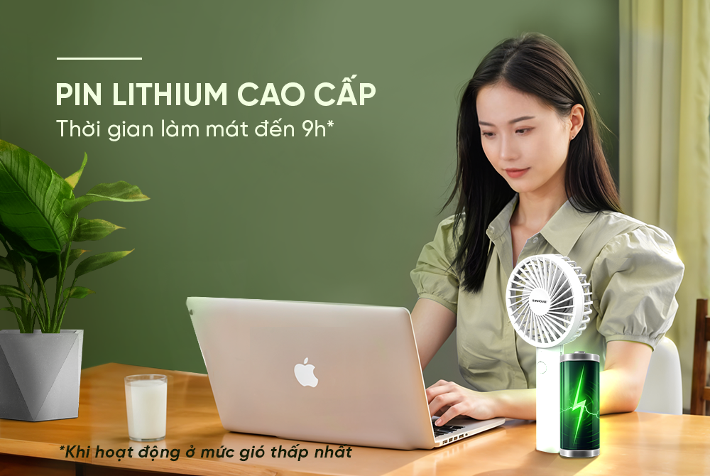 Khi được sạc đầy, quạt có thể làm mát liên tục từ 5 - 9 giờ tùy tốc độ, giúp làm mát hiệu quả khi ở ngoài trời, những khí mất điện hay giúp làm thông thoáng không khí khi bạn phải ở trong môi trường kín, đông người.
